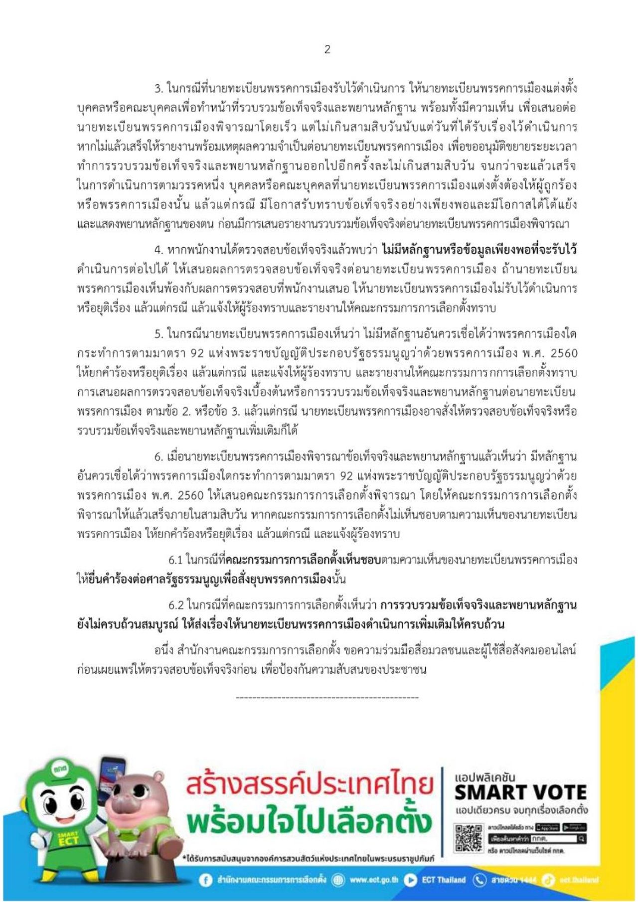 6.2 ในกรณีที่คณะกรรมการการเลือกตั้งเห็นว่า การรวบรวมข้อเท็จจริงและพยานหลักฐาน ยังไม่ครบถ้วนสมบูรณ์ ให้ส่งเรื่องให้นายทะเบียนพรรคการเมืองดำเนินการเพิ่มเติมให้ครบถ้วน ทั้งนี้ สำนักงานคณะกรรมการการเลือกตั้ง ขอความร่วมมือสื่อมวลชนและผู้ใช้สื่อสังคมออนไลน์ ก่อนเผยแพร่ให้ตรวจสอบข้อเท็จจริงก่อน เพื่อป้องกันความสับสนของประชาชน