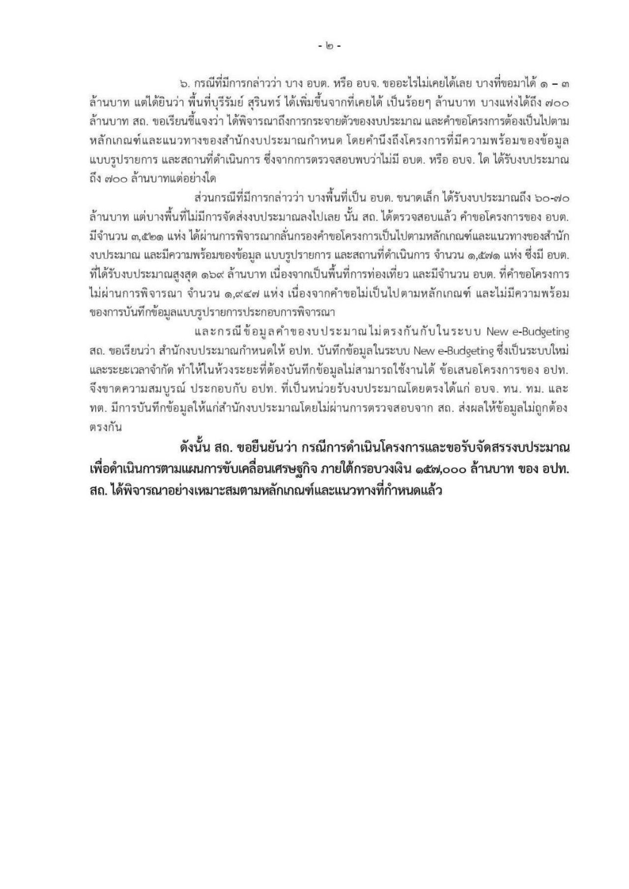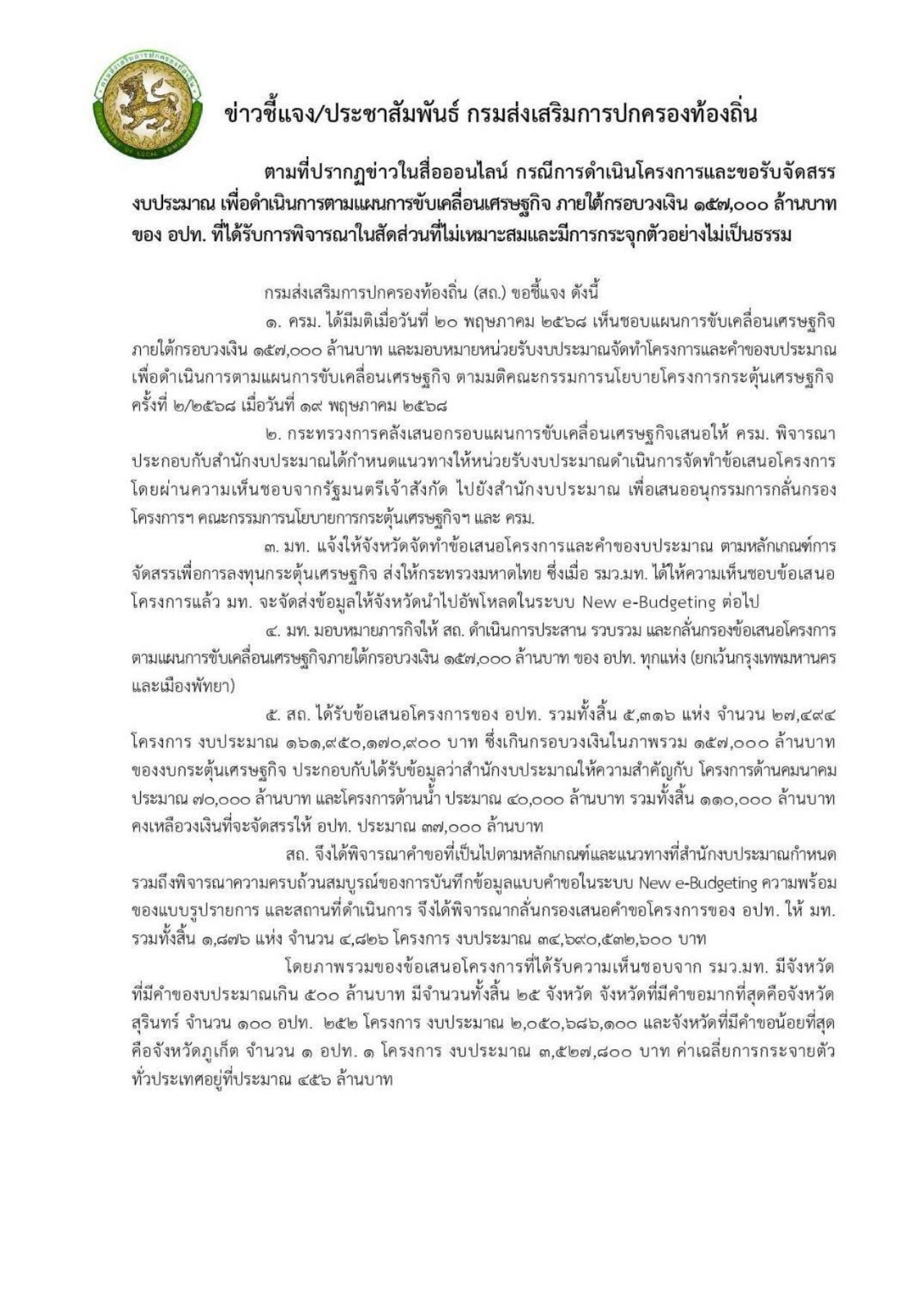 ดังนั้น สถ. ขอยืนยันว่า กรณีการดำเนินโครงการและขอรับจัดสรรงบประมาณเพื่อดำเนินการตามแผนการขับเคลื่อนเศรษฐกิจ สถ. ได้พิจารณาอย่างเหมาะสมตามหลักเกณฑ์และแนวทางที่กำหนดแล้ว
