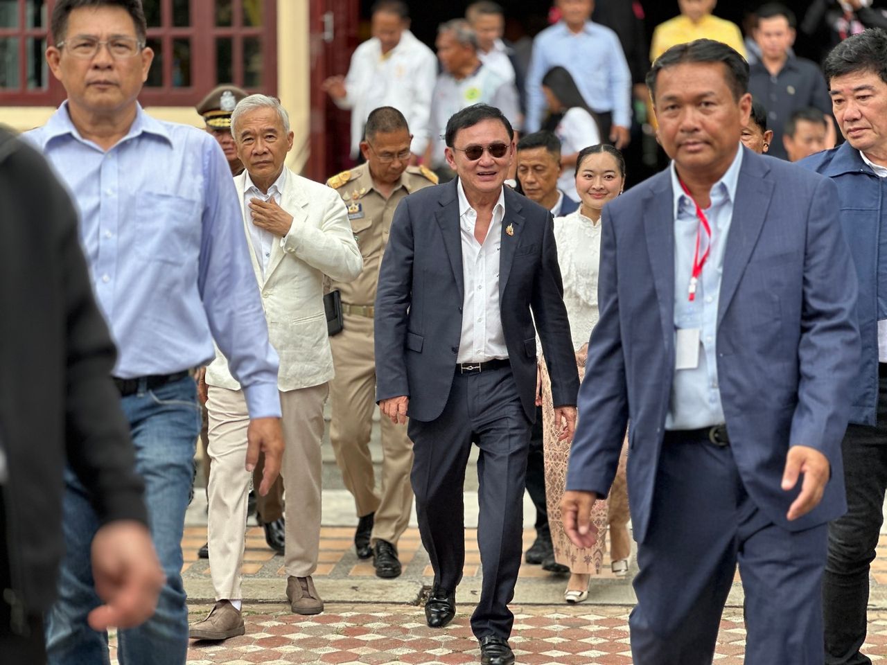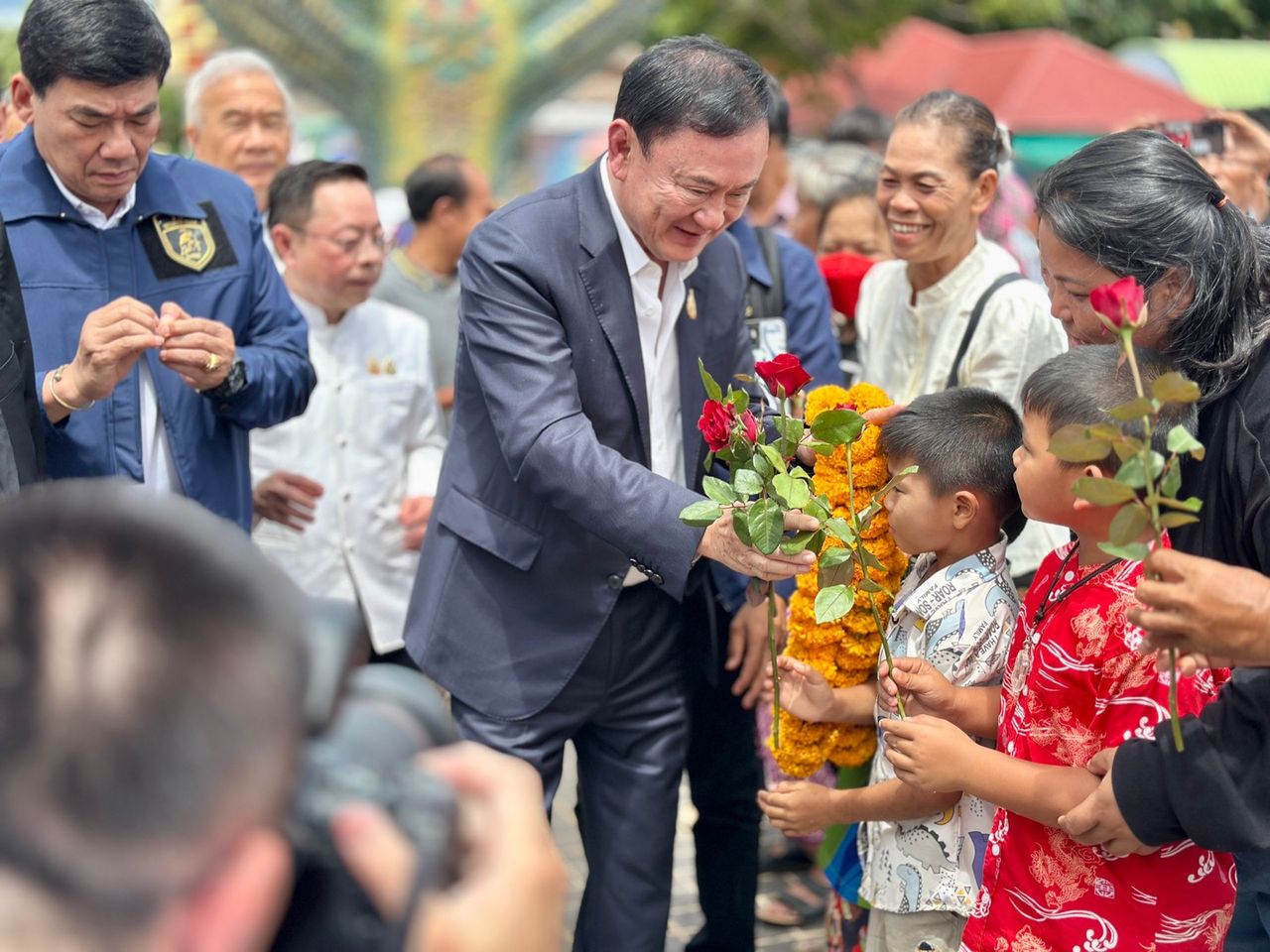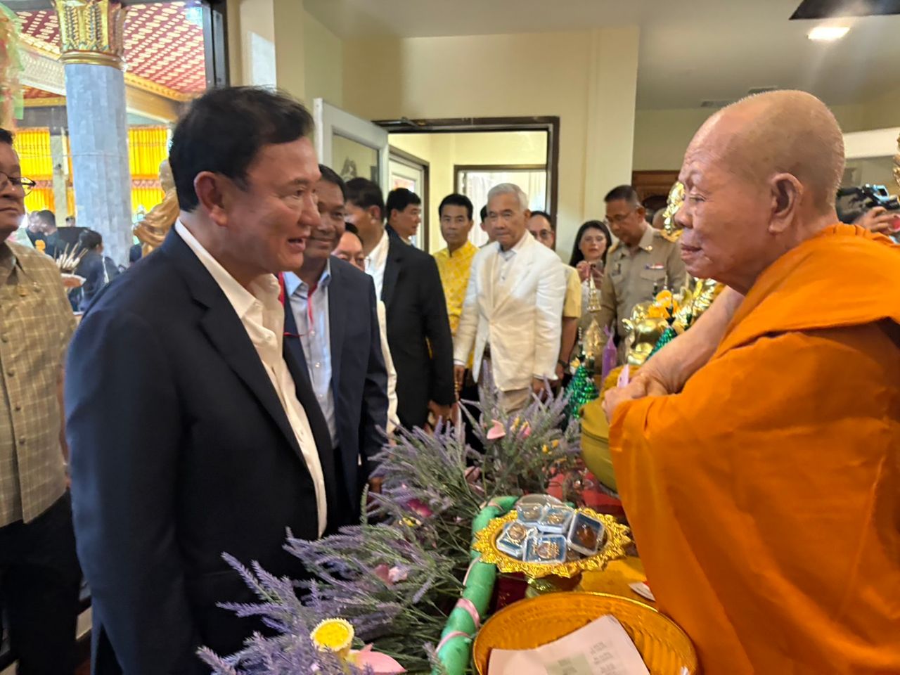 ด้านนายทักษิณ ได้เดินทางมาด้วยรถยนต์โรลส์-รอยซ์ ป้ายทะเบียน ฐฐ 267 กรุงเทพมหานคร ซึ่งมีประชาชนเสื้อแดงรอต้อนรับ โดยตะโกนให้กำลังใจนายทักษิณว่า “นายกฯสู้ๆ” “นายกฯในดวงใจ” รวมถึงมอบดอกกุหลาบ และพวงมาลัยดาวเรืองให้กับนายทักษิณ ได้สวมกอด และถ่ายรูปร่วมกับนายทักษิณ จากนั้นนายทักษิณ เดินขึ้นไปสักการะพระพุทธรูป และรูปหล่อหลวงพ่อคูณ ภายในพระวิหารเทพวิทยาคม