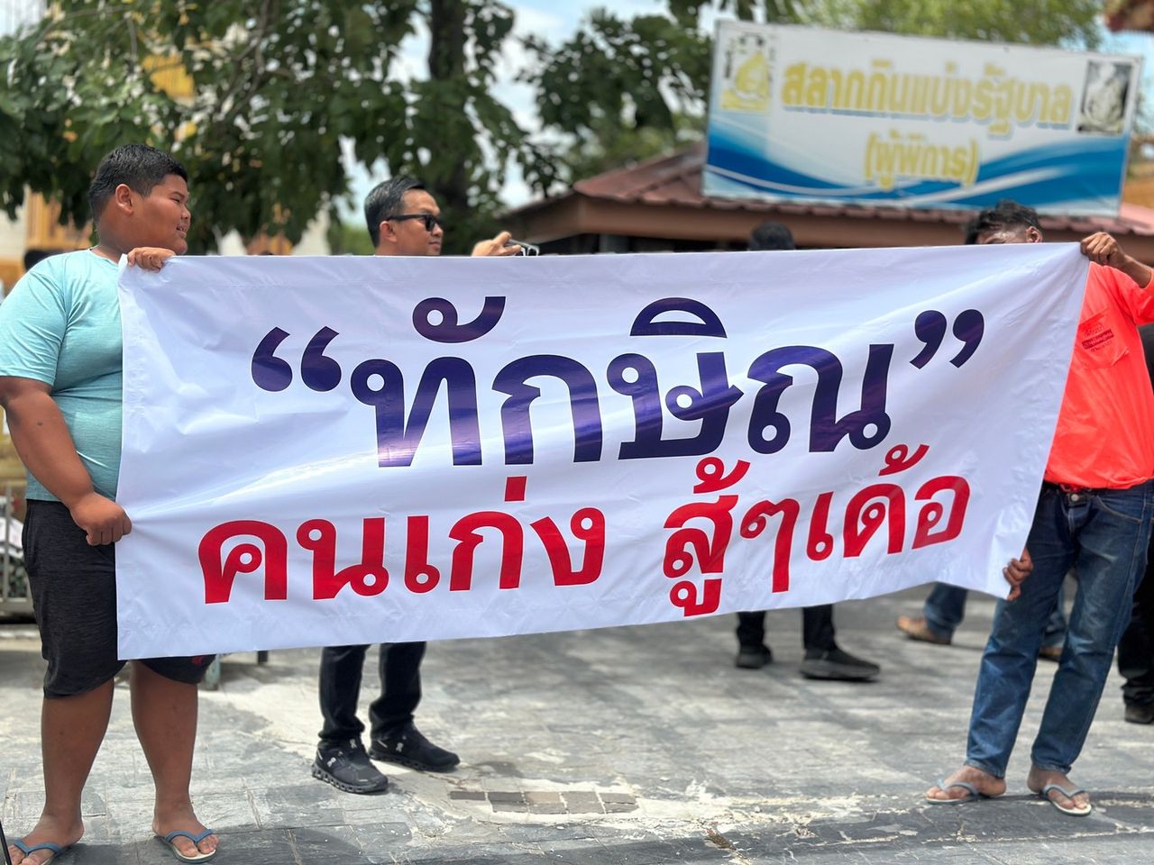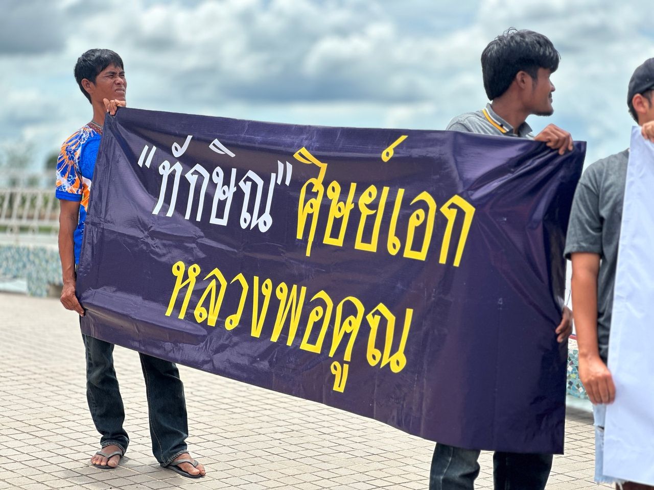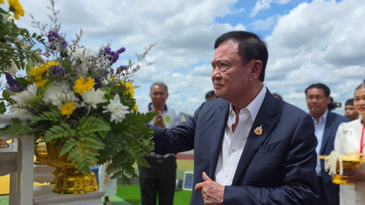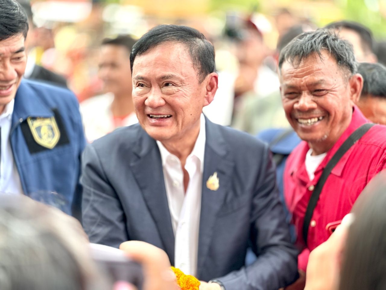 ด้านนายทักษิณ ได้เดินทางมาด้วยรถยนต์โรลส์-รอยซ์ ป้ายทะเบียน ฐฐ 267 กรุงเทพมหานคร ซึ่งมีประชาชนเสื้อแดงรอต้อนรับ โดยตะโกนให้กำลังใจนายทักษิณว่า “นายกฯสู้ๆ” “นายกฯในดวงใจ” รวมถึงมอบดอกกุหลาบ และพวงมาลัยดาวเรืองให้กับนายทักษิณ ได้สวมกอด และถ่ายรูปร่วมกับนายทักษิณ จากนั้นนายทักษิณ เดินขึ้นไปสักการะพระพุทธรูป และรูปหล่อหลวงพ่อคูณ ภายในพระวิหารเทพวิทยาคม