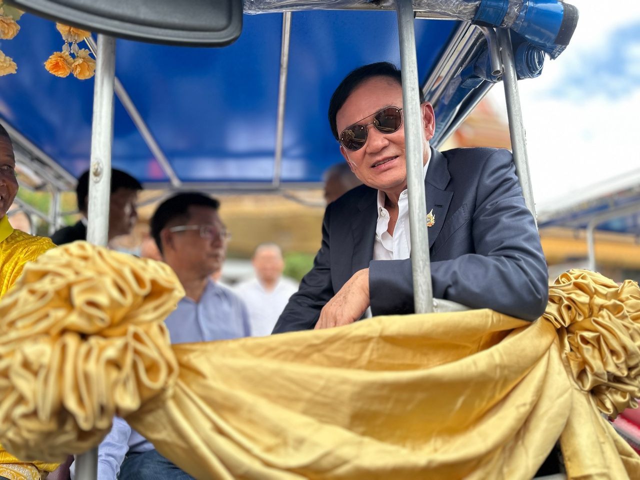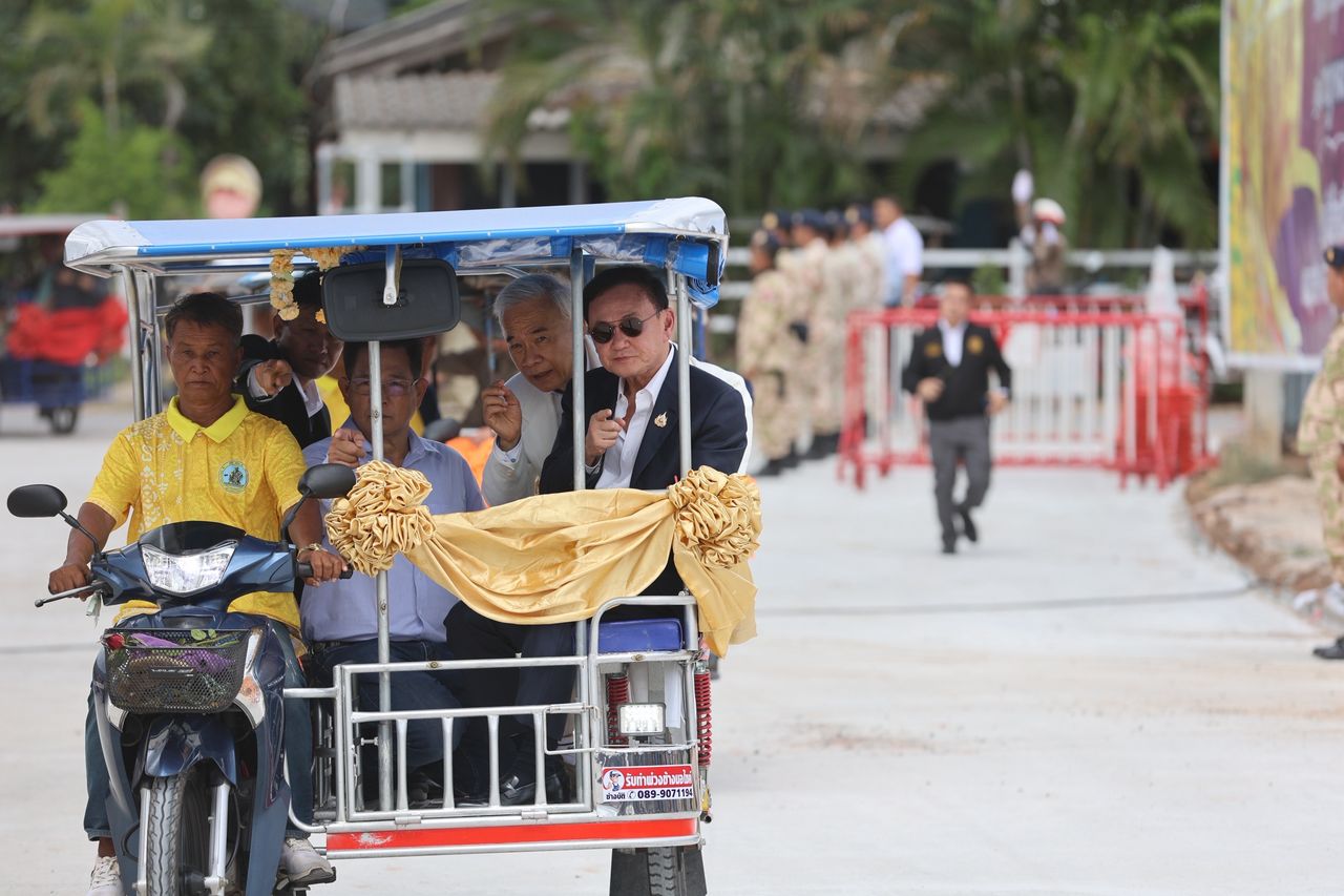 ก่อนจะนั่งสามล้อพ่วงข้างที่มีรูปนายทักษิณติดอยู่ ป้ายทะเบียน 3 กฒ 7640 นครราชสีมา ไปยังลานพิธี โดยผู้สื่อข่าวได้แซวว่า ขึ้นรถพ่วงสามล้อในรอบกี่ปี นายทักษิณ กล่าวว่า จำไม่ได้แล้ว นานมากแล้ว เคยขับแต่มอเตอร์ไซค์ พ่วงข้างไม่เคยได้ขึ้นน่าจะเป็นครั้งแรก เคยแต่นั่งสามล้อธรรมดา