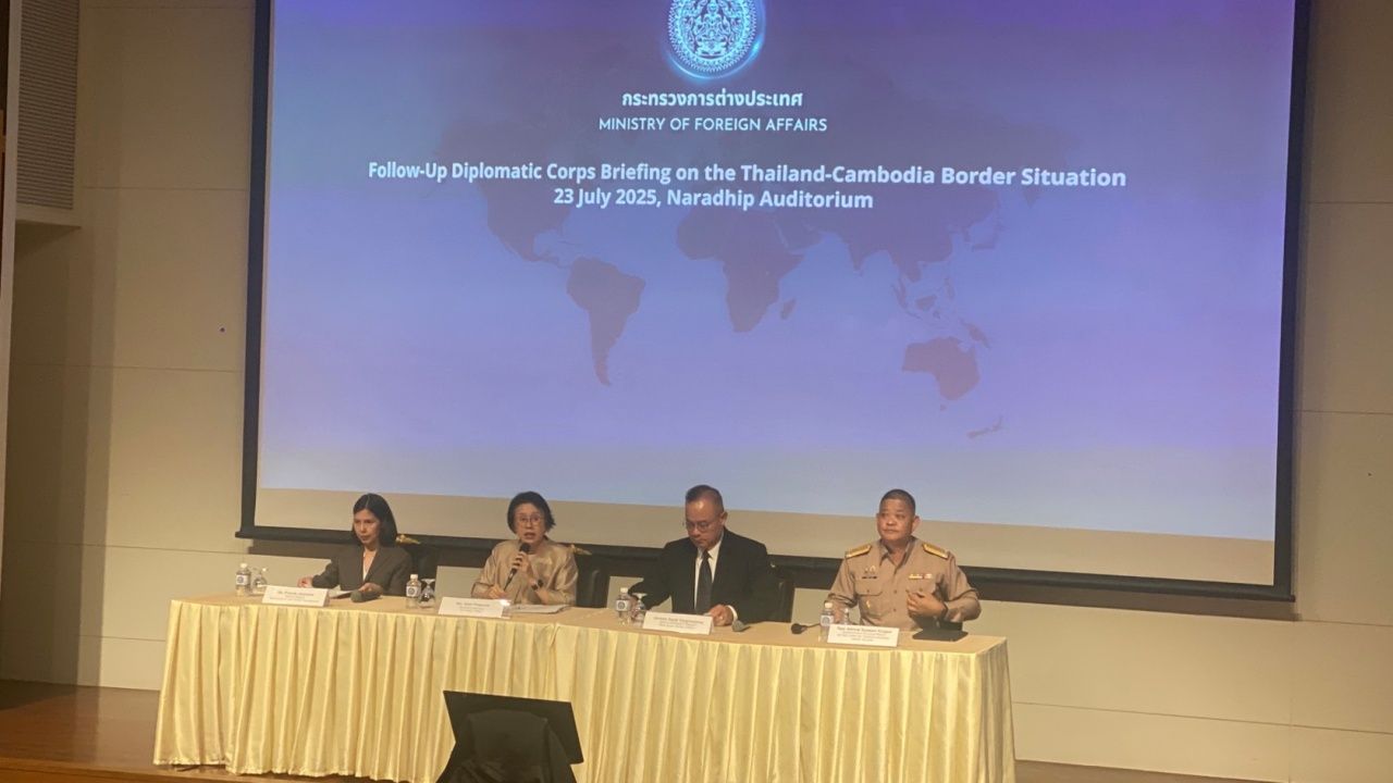 วันที่ 23 ก.ค. 2568 ที่กระทรวงการต่างประเทศ ได้จัดการบรรยายสรุปแก่คณะทูตต่างประเทศประจำประเทศไทย และผู้ช่วยทูตทหารต่างประเทศประจำประเทศไทย เกี่ยวกับสถานการณ์บริเวณชายแดนไทย-กัมพูชา โดยนางเอกสิริ ปิณฑะรุจิ ปลัดกระทรวงการต่างประเทศ, นางสาวพินทุ์สุดา ชัยนาม อธิบดีกรมองค์การระหว่างประเทศ, พลเอกศักดิ์สิทธิ์ แสงชนินทร์ ผู้อำนวยการศูนย์ปฏิบัติการทุ่นระเบิดแห่งชาติ หรือ TMAC (ที-แมกซ์) และพลเรือตรีสุรสันต์ คงสิริ โฆษกศูนย์เฉพาะกิจบริหารสถานการณ์บริเวณชายแดนไทย–กัมพูชา หรือ ศบ.ทก โดยมีเอกอัครราชทูต และผู้แทนจากสถานทูตต่างประเทศประจำประเทศไทย จำนวน 93 คน จาก 68 ประเทศเข้าร่วมรับฟัง โดยสถานเอกอัครราชทูตกัมพูชาประจำประเทศไทย ไม่ได้ส่งตัวแทนเข้าร่วมรับฟังการบรรยายสรุปในครั้งนี้ ทั้งที่กระทรวงการต่างประเทศได้ออกหนังสือเชิญไปแล้ว