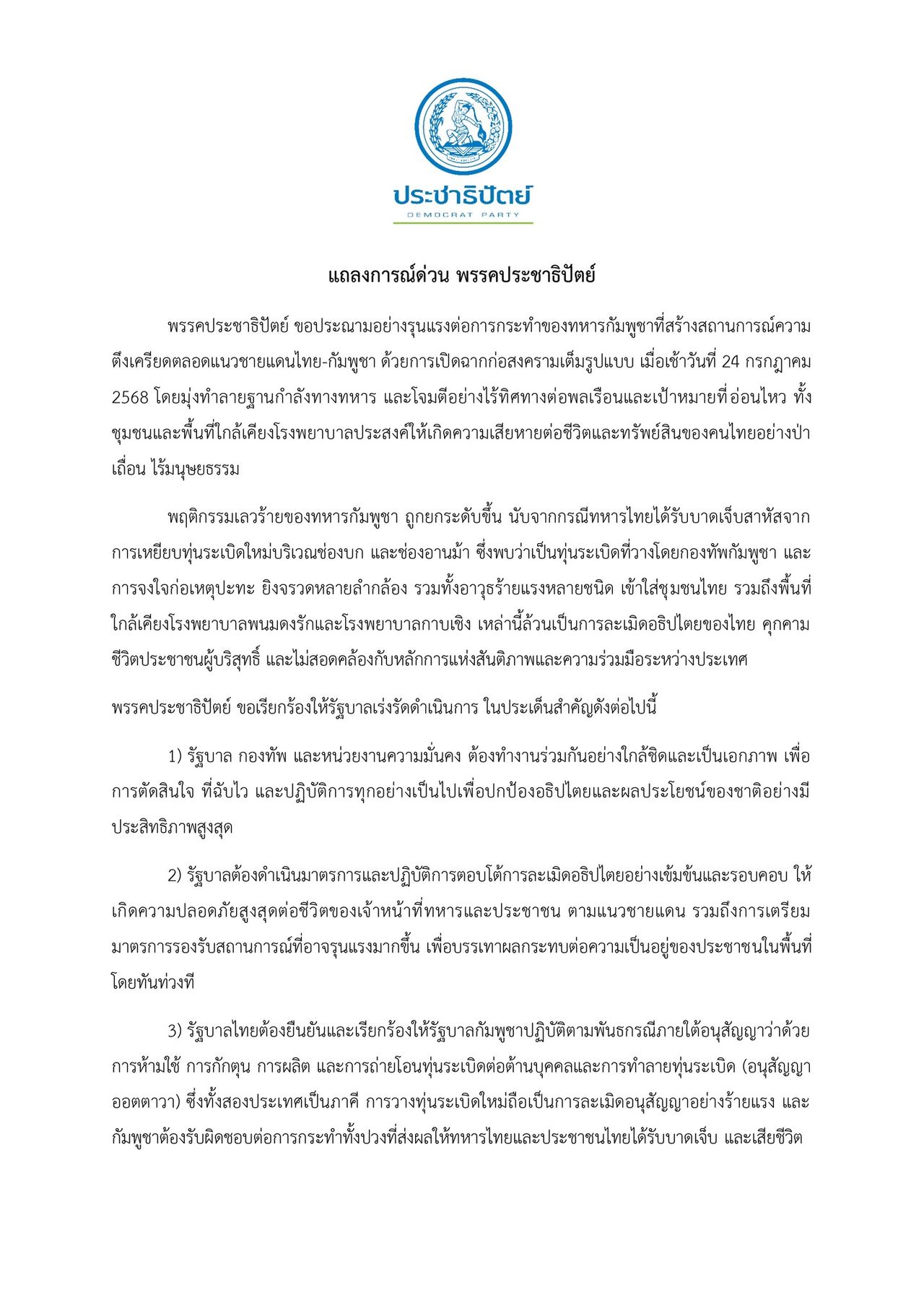 วันที่ 24 กรกฎาคม 2568 พรรคประชาธิปัตย์ ออกแถลงการณ์ด่วนถึงสถานการณ์ไทย-กัมพูชา ว่า พรรคประชาธิปัตย์ ขอประณามอย่างรุนแรงต่อการกระทำของทหารกัมพูชาที่สร้างสถานการณ์ความตึงเครียดตลอดแนวชายแดนไทย-กัมพูชา ด้วยการเปิดฉากก่อสงครามเต็มรูปแบบ เมื่อเช้าวันนี้ (24 กรกฎาคม) โดยมุ่งทำลายฐานกำลังทางทหาร และโจมตีอย่างไร้ทิศทางต่อพลเรือนและเป้าหมายที่อ่อนไหว ทั้งชุมชนและพื้นที่ใกล้เคียงโรงพยาบาล ประสงค์ให้เกิดความเสียหายต่อชีวิตและทรัพย์สินของคนไทยอย่างป่าเถื่อน ไร้มนุษยธรรม
