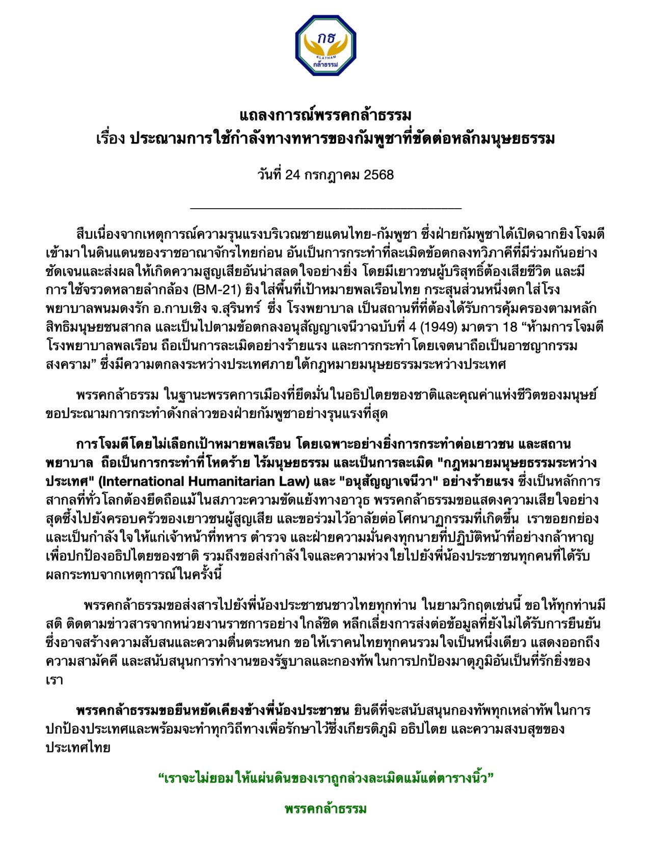 พรรคกล้าธรรม ในฐานะพรรคการเมืองที่ยึดมั่นในอธิปไตยของชาติและคุณค่าแห่งชีวิตของมนุษย์ ขอประณามการกระทำดังกล่าวของฝ่ายกัมพูชาอย่างรุนแรงที่สุด การโจมตีโดยไม่เลือกเป้าหมายพลเรือน โดยเฉพาะอย่างยิ่งการกระทำต่อเยาวชนและสถานพยาบาล ถือเป็นการกระทำที่โหดร้าย ไร้มนุษยธรรม และเป็นการละเมิด กฎหมายมนุษยธรรมระหว่างประเทศ (International Humanitarian Law) และ “อนุสัญญาเจนีวา” อย่างร้ายแรง ซึ่งเป็นหลักการสากลที่ทั่วโลกต้องยึดถือแม้ในสภาวะความขัดแย้งทางอาวุธ