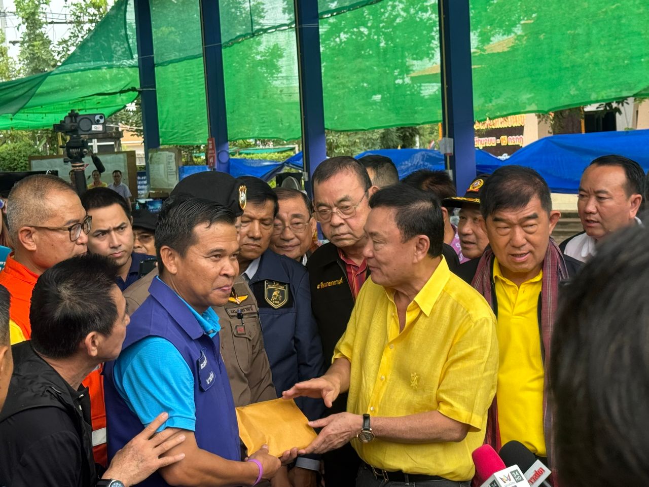 ต่อมานายทักษิณได้เดินต่อไปที่อาคารศูนย์พักพิง ที่มีประชาชนนั่งรอรับอาหารและสิ่งของเครื่องใช้ที่จะมามอบในวันนี้ นายทักษิณเห็นรถขายอาหารและเครื่องดื่ม ได้เดินไปถาม ร้านแรกเหมาขนมโตเกียว โดยบอกว่าเหมาทั้งหมดเพื่อให้ทำไปเลี้ยงชาวบ้านที่อยู่ในศูนย์พักพิงนี้ และเจ้าหน้าที่ที่มาปฏิบัติงาน จากนั้นได้เดินไปเหมาร้านขายน้ำและไส้กรอกอีสาน โดยสั่งไว้ว่าเหมาทั้งหมดห้ามเอากลับบ้าน