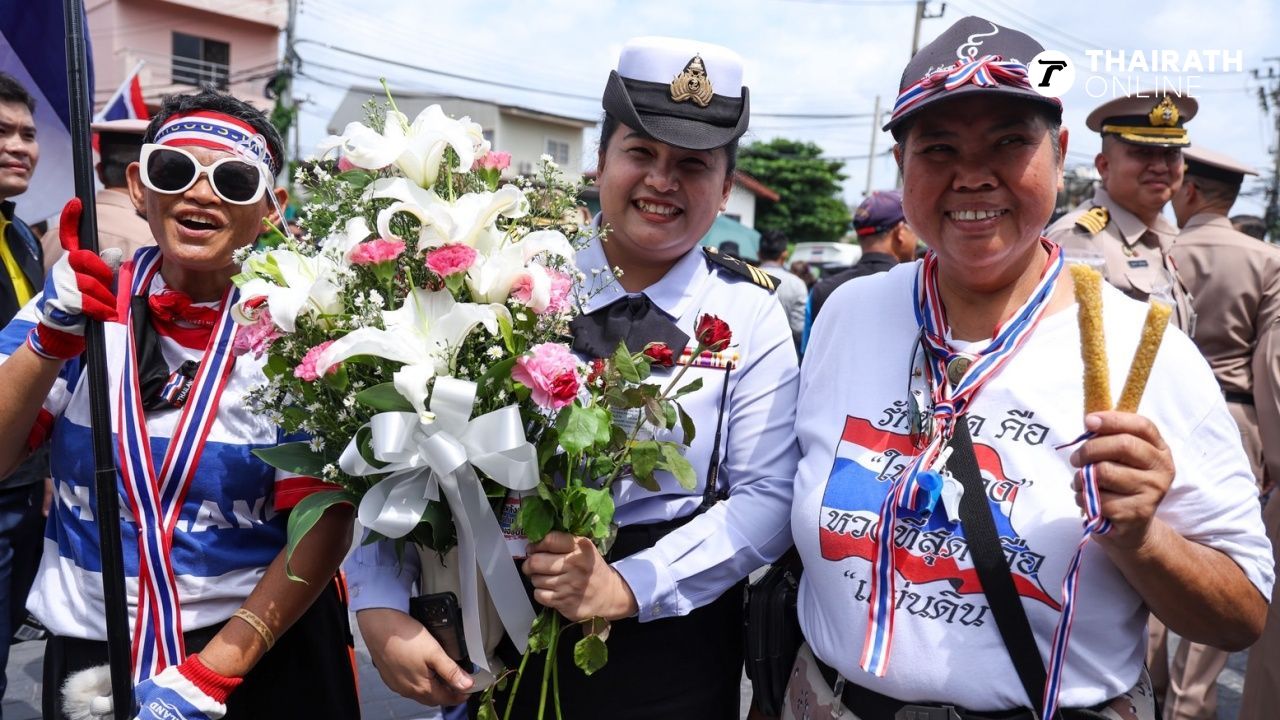 วันที่ 31 ก.ค. 2568 ที่หน้ากองบัญชาการกองทัพเรือ ถ.อรุณอัมรินทร์ คณะรวมพลังแผ่นดินปกป้องอธิปไตย นำโดย นายจตุพร พรหมพันธุ์ นายนิติธร ล้ำเหลือ นายพิชิต ไชงคล นายใจเพชร กล้าจน และนายแซมดิน เลิศบุศย์ ฯลฯ นำกลุ่มมวลชนจำนวนหนึ่ง ซึ่งประกอบด้วย เครือข่าย คปท. กองทัพธรรม พรรคสัมมาธิปไตย และสมาพันธ์แรงงานรัฐวิสาหกิจสัมพันธ์ เดินทางมายื่นหนังสือและมอบดอกกุหลาบให้กำลังใจทหารเรือ และนาวิกโยธิน ที่ปฏิบัติหน้าที่ในการปกป้องอธิปไตยของชาติบริเวณชายแดนไทย-กัมพูชา ฝั่ง จ.ตราด จันทบุรี อย่างกล้าหาญ โดยมี น.อ.ชลภู ชูศรี รองเลขานุการกองทัพเรือ เป็นผู้แทนกองทัพเรือรับมอบ พร้อมกล่าวขอบคุณทุกแรงสนับสนุน และยืนยันว่าทหารเรือจะปกป้องผลประโยชน์ของชาติทั้งทางบกและทางทะเลอย่างเต็มกำลัง