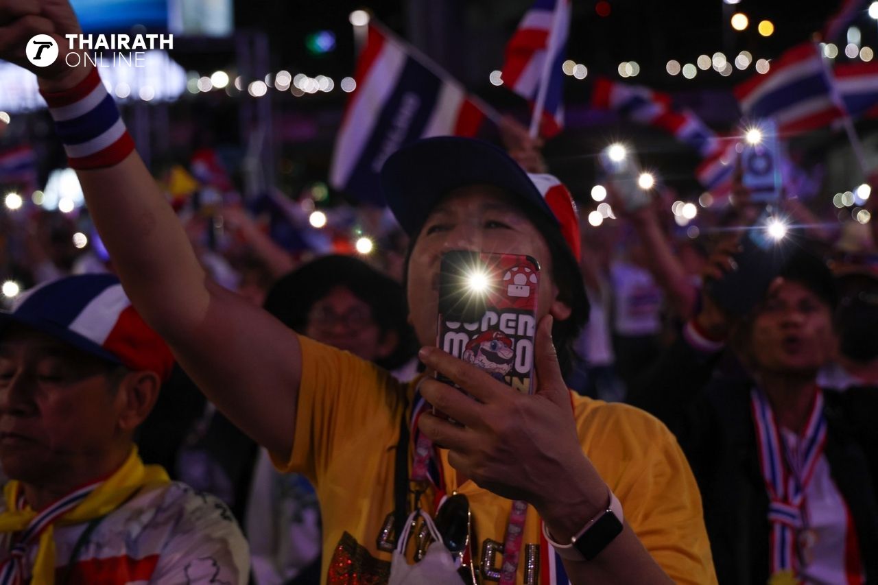 จากนั้นให้มวลชนเปิดแฟลชโทรศัพท์ ร้องเพลงพระราชนิพนธ์ “เราสู้” ที่นายสุเมธ องอาจ นักร้องชื่อดังนำร้องเพลง