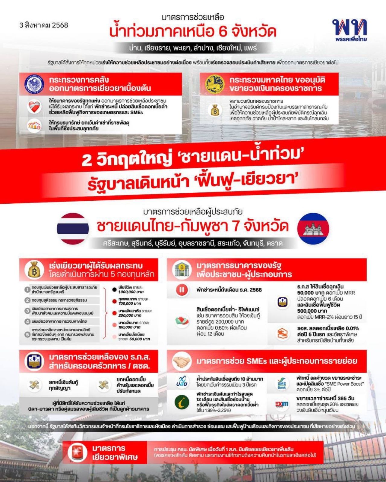 “เพื่อไทย” แจกแจงเดินหน้า “ฟื้นฟู–เยียวยา–ป้องกัน” 2 วิกฤตใหญ่ “ชายแดน–น้ำท่วม” สั่งหน่วยงานบูรณาการช่วยเหลือเร่งด่วน