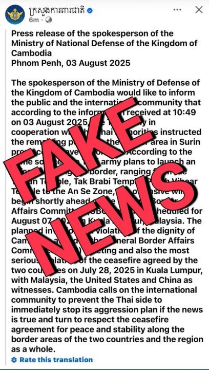 ทำให้ศูนย์เฉพาะกิจบริหารสถานการณ์บริเวณชายแดนไทย-กัมพูชา (ศบ.ทก.) ได้ชี้แจงเรื่องนี้ทันทีเช่นกัน โดยระบุว่ากรณีที่โฆษกกลาโหมกัมพูชากล่าวหาว่ากองทัพไทยสั่งอพยพชาวสุรินทร์คืนนี้ เพื่อเตรียมเปิดฉากยิงก่อนหารือ GBC พรุ่งนี้ (4 ส.ค. 2568) เป็น FAKE NEWS
