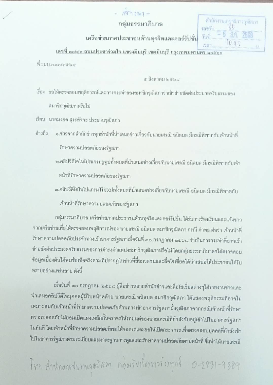 "กลุ่มธรรมาภิบาล ภาคประชาชน" รุกร้อง "ประธานวุฒิสภา" จี้ เร่งสอบจริยธรรมร้ายแรง "สว.เศรณี" เซ่นคลิปหลุด ด่า รปภ.รัฐสภา ตึก สว. ไม่ยอมเปิดแผงเหล็กกั้นให้