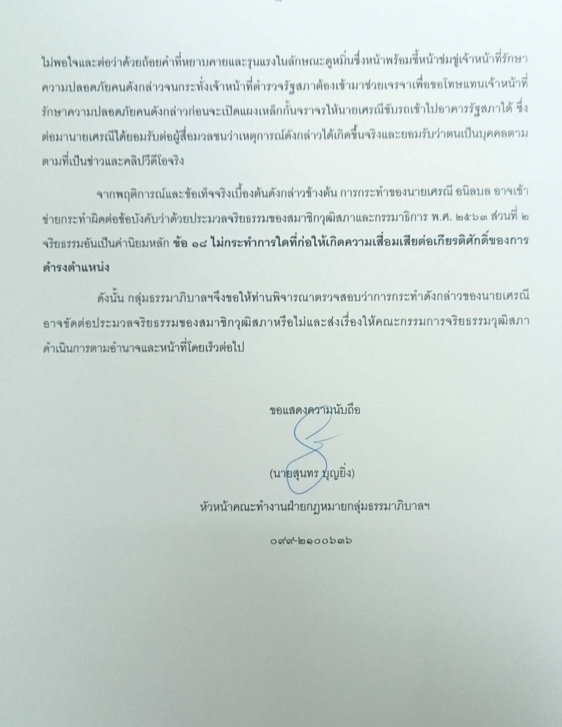 วันที่ 5 ส.ค. 2568 นายสุนทร บุญยิ่ง หัวหน้าคณะทำงานฝ่ายกฎหมายกลุ่มธรรมาภิบาลเครือข่ายภาคประชาชนด้านทุจริตและคอร์รัปชั่น ได้ทำหนังสือถึง นายมงคล สุระสัจจะ ประธานวุฒิสภา เพื่อขอให้ตรวจสอบพฤติการณ์และการกระทำของสมาชิกวุฒิสภาว่าเข้าข่ายขัดต่อประมวลจริยธรรมของสมาชิกวุฒิสภาหรือไม่ โดยนายสุนทร กล่าวว่า จากกรณีนายเศรณี อนิลบล สว. ได้แสดงพฤติกรรมไม่เหมาะสมกับเจ้าหน้าที่รักษาความปลอดภัยด้านทางเข้าอาคารรัฐสภาฝั่งวุฒิสภาจากกรณีเจ้าหน้าที่รักษาความปลอดภัย(รปภ.)ไม่ยอมเปิดแผงเหล็กกั้นจราจรให้รถยนต์ที่กำลังขับอยู่เข้าไปในอาคารรัฐสภาในทันที โดยนายเศรณีได้ต่อว่า รปภ.ด้วยถ้อยคำที่หยาบคายและรุนแรงในลักษณะดูหมิ่นซึ่งหน้าพร้อมชี้หน้าข่มขู่ รปภ.พฤติการณ์และข้อเท็จจริงเบื้องต้น อาจเข้าข่ายกระทำผิดต่อข้อบังคับว่าด้วยประมวลจริยธรรมของสมาชิกวุฒิสภาและกรรมาธิการ พ.ศ. 2563 ส่วนที่ 2 จริยธรรมอันเป็นค่านิยมหลัก ข้อ 18 ไม่กระทำการใดที่ก่อให้เกิดความเสื่อมเสียต่อเกียรติศักดิ์ของการดำรงตำแหน่ง จึงขอให้ประธานวุฒิสภา พิจารณาตรวจสอบว่า การกระทำดังกล่าวขัดต่อประมวลจริยธรรมของ สว.หรือไม่ และส่งเรื่องให้คณะกรรมการจริยธรรมวุฒิสภาดำเนินการตามอำนาจและหน้าที่โดยเร็วต่อไป