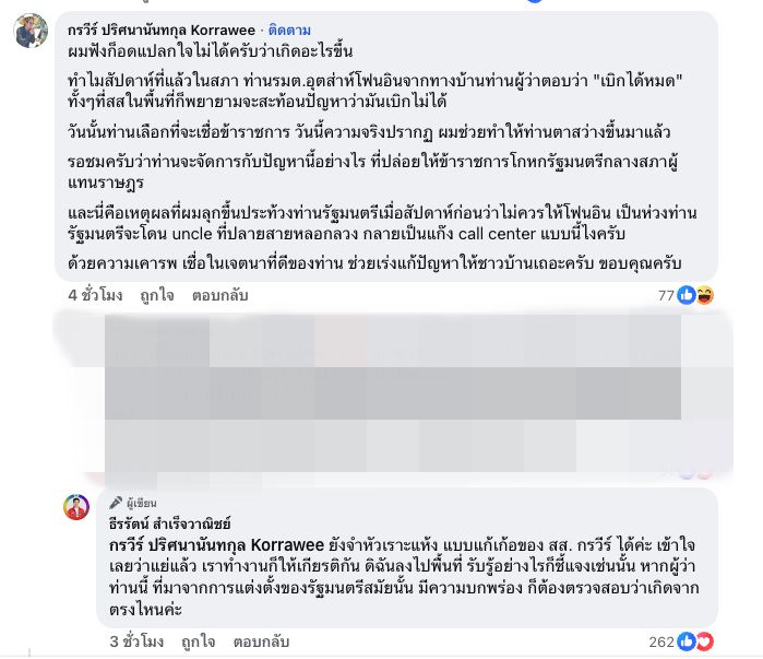 ขณะที่นายกรวีร์ คอมเมนต์ตอบกลับอีกว่า ผมฟังก็อดแปลกใจไม่ได้ครับว่าเกิดอะไรขึ้น ทำไมสัปดาห์ที่แล้วในสภา ท่านรมต.อุตส่าห์โฟนอินจากทางบ้านท่านผู้ว่าตอบว่า “เบิกได้หมด” ทั้งๆ ที่สส.ในพื้นที่ก็พยายามจะสะท้อนปัญหาว่ามันเบิกไม่ได้ วันนั้นท่านเลือกที่จะเชื่อข้าราชการ วันนี้ความจริงปรากฏ ผมช่วยทำให้ท่านตาสว่างขึ้นมาแล้ว รอชมครับว่าท่านจะจัดการกับปัญหานี้อย่างไร ที่ปล่อยให้ข้าราชการโกหกรัฐมนตรีกลางสภาผู้แทนราษฎร และนี่คือเหตุผลที่ผมลุกขึ้นประท้วงท่านรัฐมนตรีเมื่อสัปดาห์ก่อนว่าไม่ควรให้โฟนอิน เป็นห่วงท่านรัฐมนตรีจะโดน uncle ที่ปลายสายหลอกลวง กลายเป็นแก๊ง call center แบบนี้ไงครับ ด้วยความเคารพ เชื่อในเจตนาที่ดีของท่าน ช่วยเร่งแก้ปัญหาให้ชาวบ้านเถอะครับ ขอบคุณครับ
