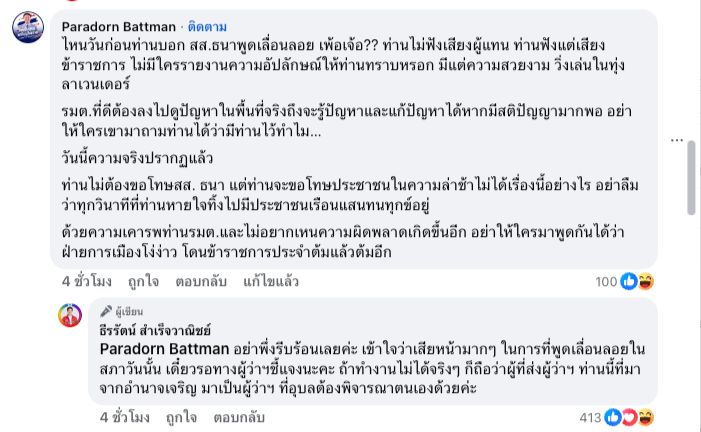 ด้านนายภราดร ปริศนานันทกุล สส.อ่างทอง พรรคภูมิใจไทย ได้เข้ามาคอมเมนต์โพสต์ดังกล่าวว่า ไหนวันก่อนท่านบอก สส.ธนา (ธนา กิจไพบูลย์ชัย สส.ศรีสะเกษ พรรคภูมิใจไทย) พูดเลื่อนลอย เพ้อเจ้อ?? ท่านไม่ฟังเสียงผู้แทน ท่านฟังแต่เสียงข้าราชการ ไม่มีใครรายงานความอัปลักษณ์ให้ท่านทราบหรอก มีแต่ความสวยงาม วิ่งเล่นในทุ่งลาเวนเดอร์ รมต.ที่ดีต้องลงไปดูปัญหาในพื้นที่จริงถึงจะรู้ปัญหาและแก้ปัญหาได้หากมีสติปัญญามากพอ อย่าให้ใครเขามาถามท่านได้ว่ามีท่านไว้ทำไม… วันนี้ความจริงปรากฏแล้ว ท่านไม่ต้องขอโทษสส. ธนา แต่ท่านจะขอโทษประชาชนในความล่าช้าไม่ได้เรื่องนี้อย่างไร อย่าลืมว่าทุกวินาทีที่ท่านหายใจทิ้งไปมีประชาชนเรือนแสนทนทุกข์อยู่ ด้วยความเคารพท่านรมต.และไม่อยากเห็นความผิดพลาดเกิดขึ้นอีก อย่าให้ใครมาพูดกันได้ว่าฝ่ายการเมืองโง่ง่าว โดนข้าราชการประจำต้มแล้วต้มอีก ด้านน.ส.ธีรรัตน์ ตอบกลับว่าอย่าพึ่งรีบร้อนเลยค่ะ เข้าใจว่าเสียหน้ามากๆ ในการที่พูดเลื่อนลอยในสภาวันนั้น เดี๋ยวรอทางผู้ว่าฯชี้แจงนะคะ ถ้าทำงานไม่ได้จริงๆ ก็ถือว่าผู้ที่ส่งผู้ว่าฯ ท่านนี้ที่มาจากอำนาจเจริญ มาเป็นผู้ว่าฯ ที่อุบลต้องพิจารณาตนเองด้วยค่ะ