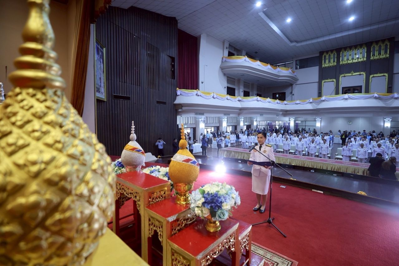 โดยนางนฤมล ในฐานะประธานในพิธี ได้นำคณะประกอบพิธีเจริญพระพุทธมนต์ โดยมีพระสงฆ์จำนวน 109 รูป ร่วมสวดมนต์ จากนั้นประกอบพิธีถวายพระพรชัยมงคล พร้อมนำผู้เข้าร่วมพิธีร้องเพลงสรรเสริญพระบารมี และเพลงสดุดีพระแม่ไทย ต่อมาเวลา 08.09 น. ผู้เข้าร่วมพิธีได้ร่วมทำบุญตักบาตรพระสงฆ์และสามเณร จำนวน 94 รูป