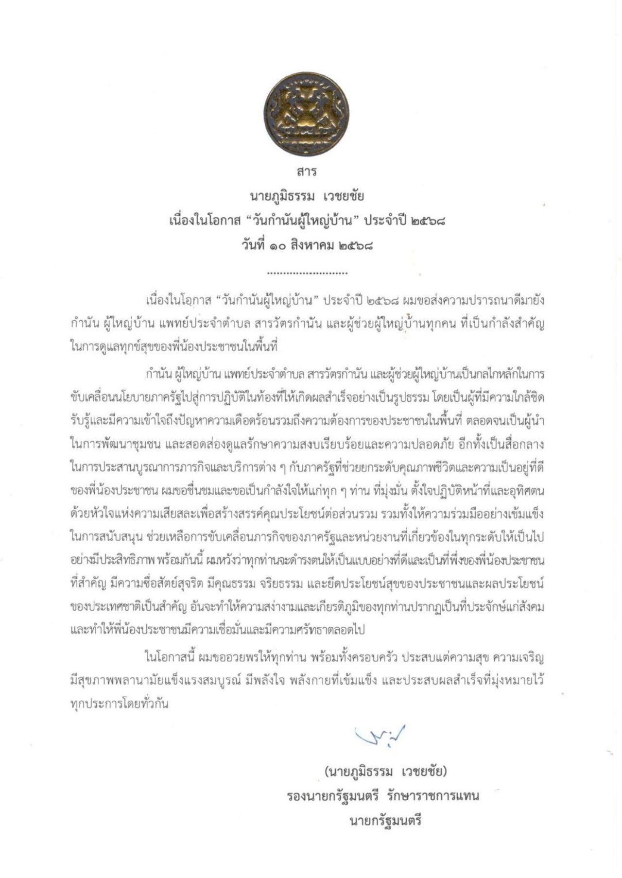 วันที่ 10 สิงหาคม 2568 นายภูมิธรรม เวชยชัย รองนายกรัฐมนตรีและรัฐมนตรีว่าการกระทรวงมหาดไทย ในฐานะรักษาราชการแทนนายกรัฐมนตรี มอบสารเนื่องในวันกำนันผู้ใหญ่บ้าน ประจำปี 2568 ว่า เนื่องในโอกาส “วันกำนันผู้ใหญ่บ้าน” ประจำปี 2568 ขอส่งความปรารถนาดีมายังกำนัน ผู้ใหญ่บ้าน แพทย์ประจำตำบล สารวัตรกำนัน และผู้ช่วยผู้ใหญ่บ้านทุกคน ที่เป็นกำลังสำคัญในการดูแลทุกข์สุขของพี่น้องประชาชนในพื้นที่