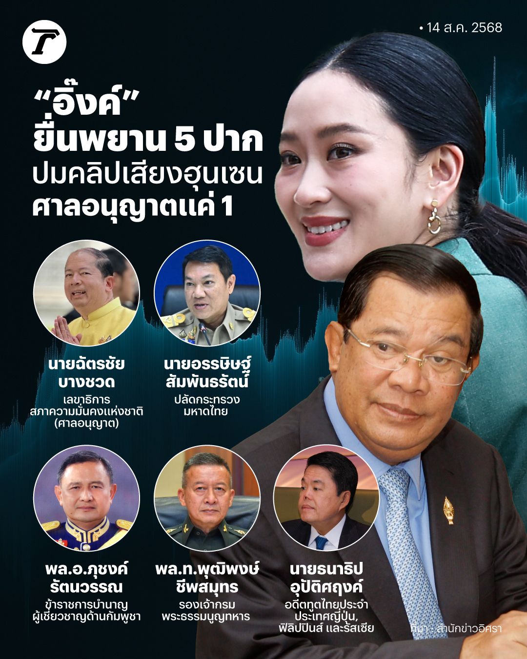 วันที่ 14 สิงหาคม 2568 จากกรณีคดีคลิปเสียงสนทนาของ น.ส.แพทองธาร ชินวัตร นายกรัฐมนตรีและรัฐมนตรีว่าการกระทรวงวัฒนธรรม กับสมเด็จฮุน เซน ประธานวุฒิสภากัมพูชา ซึ่งวานนี้ (13 สิงหาคม 2568) ศาลรัฐธรรมนูญกำหนดนัดไต่สวนพยานบุคคลจำนวน 2 ปาก คือ น.ส.แพทองธาร และเลขาธิการสภาความมั่นคงแห่งชาติ (เลขาธิการ สมช.) ในวันพฤหัสบดีที่ 21 สิงหาคม 2568 เวลา 10.30 น. โดยพยานบุคคลที่ศาลรัฐธรรมนูญเรียก หากไม่มาตามกำหนดนัดถือว่าไม่ติดใจเป็นพยานบุคคล และให้ผู้ร้องหรือผู้ถูกร้องที่ประสงค์จะแถลงการณ์ปิดคดีให้ยื่นเป็นหนังสือต่อศาลภายในวันพุธที่ 27 สิงหาคม 2568 หากไม่ยื่นภายในกำหนดถือว่าไม่ติดใจยื่น โดยศาลรัฐธรรมนูญนัดแถลงด้วยวาจา ปรึกษาหารือ และลงมติ ในวันศุกร์ที่ 29 สิงหาคม 2568 เวลา 09.30 น. นัดฟังคำวินิจฉัยเวลา 15.00 น. เป็นต้นไป