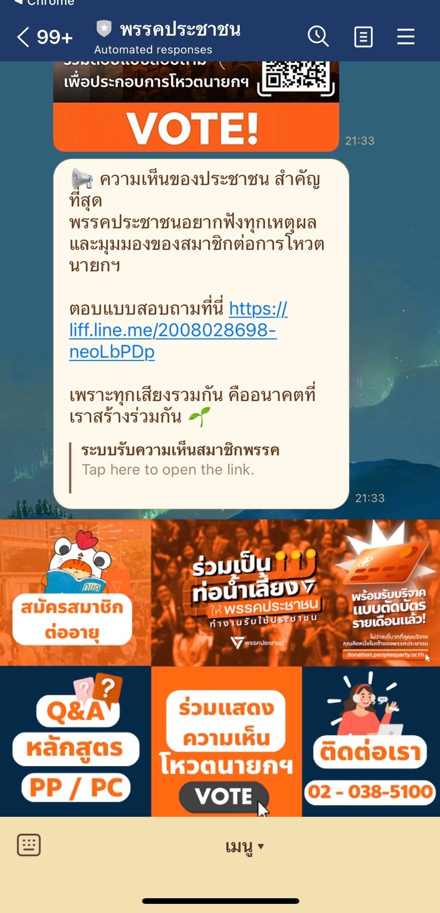 พรรคประชาชน ยิงข้อความผ่านบรอดแคสต์ทั้ง ไลน์ OA และ SMS เปิดรับฟังเสียงสมาชิกพรรคทั่วประเทศ เรื่องโหวตนายกฯ ถามคำถามสำคัญ หากจำเป็นต้องหนุนจะเลือกใครระหว่าง เพื่อไทย และ ภูมิใจไทย แค่ 2 ชอยส์