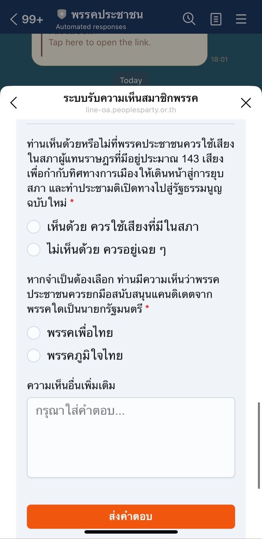 2. หากจำเป็นต้องเลือก ท่านมีความเห็นว่าพรรคประชาชนควรยกมือสนับสนุนแคนดิเดตจากพรรคใดเป็นนายกรัฐมนตรี และมีคำตอบให้เลือกคือ พรรคเพื่อไทย และพรรคภูมิใจไทย นอกจากนี้ ยังมีช่องให้สามารถกรอกความเห็นอื่นเพิ่มเติม ทั้งนี้ เมื่อกดเข้าไปในลิงก์ จะต้องมีการยืนยันตัวตนว่า เป็นสมาชิกพรรคประชาชนด้วย จึงจะสามารถแสดงความคิดเห็นได้