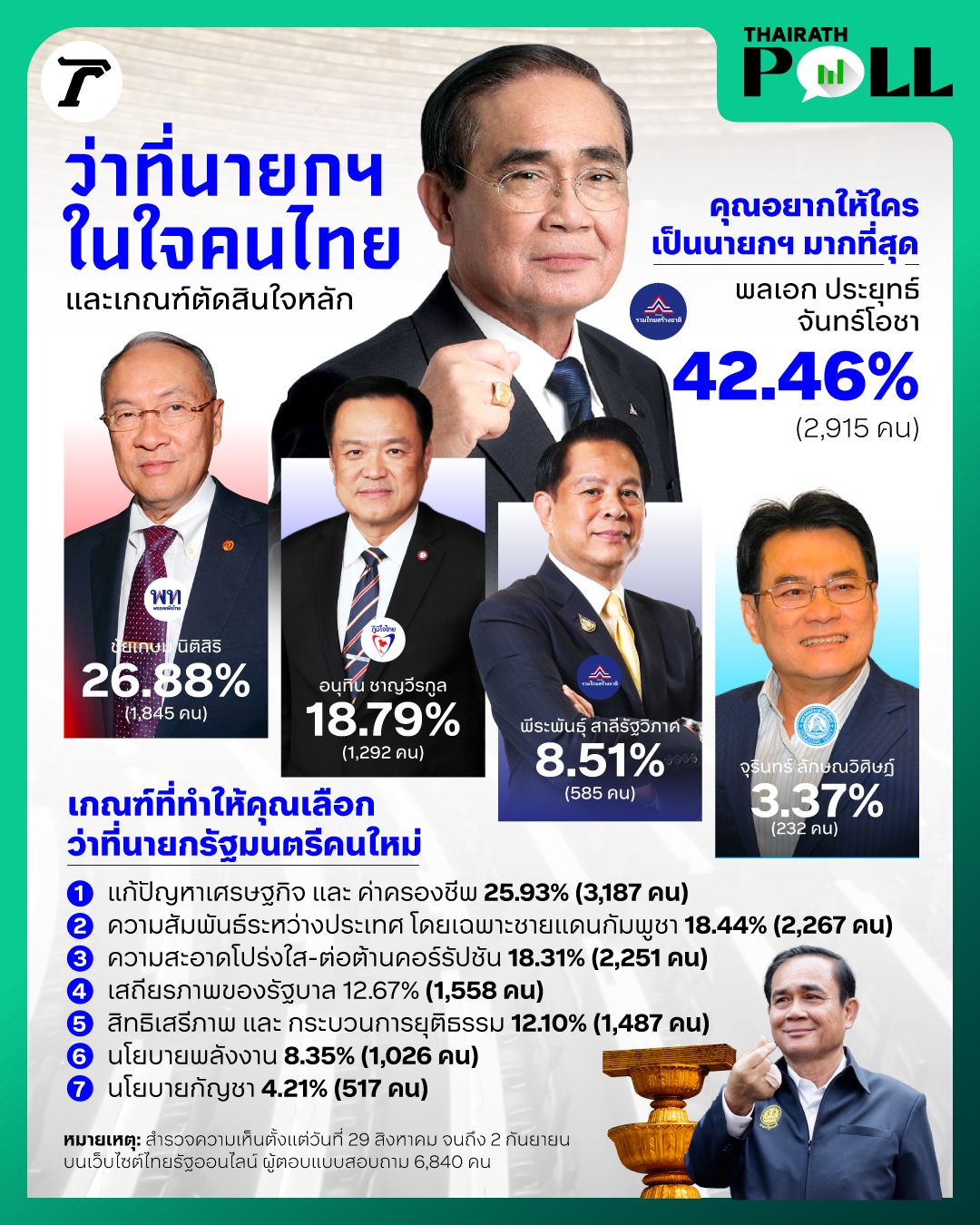 นอกเหนือจากคำถามเกี่ยวกับตัวบุคคลแล้ว ในโพลนี้ยังได้สำรวจถึงเกณฑ์ที่ทำให้คุณเลือกนายกรัฐมนตรีคนใหม่ โดยผู้ตอบแบบสอบถามสามารถตอบได้มากกว่า 1 ข้อ ซึ่งมีผู้ตอบคำถามนี้ 5,451 คน