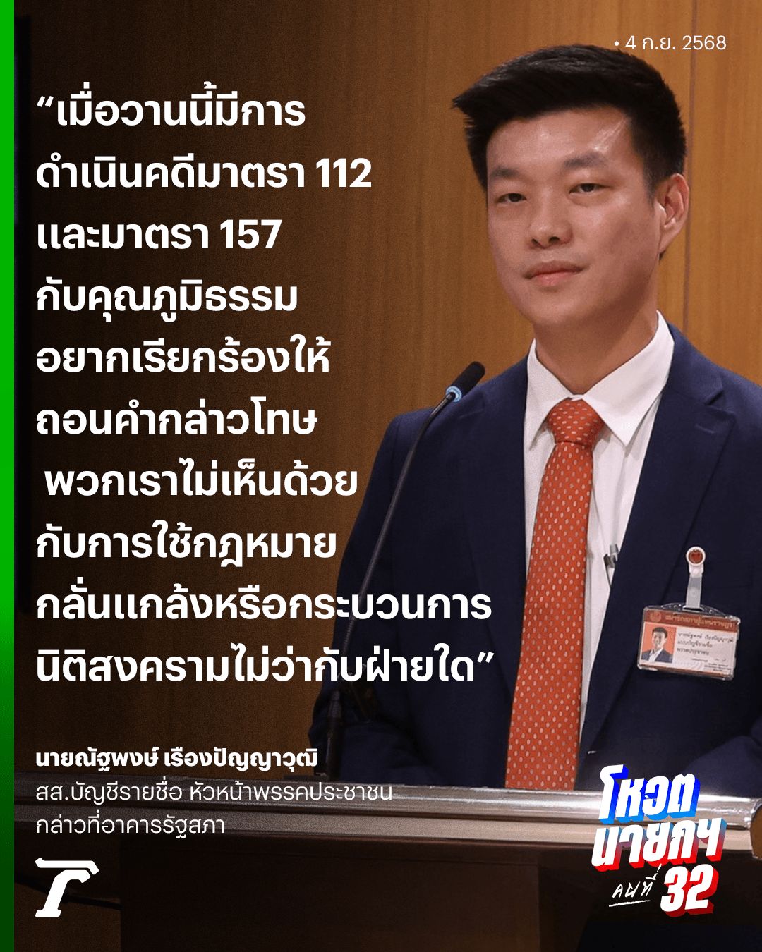 ประการที่ 2 เมื่อวานนี้มีการดำเนินคดีมาตรา 112 และมาตรา 157 กับนายภูมิธรรม ตนและพรรคประชาชนไม่เห็นด้วยกับการใช้เครื่องมือทางกฎหมายดำเนินคดีดังกล่าว อยากจะเรียกร้องให้ผู้ร้องถอนคำกล่าวโทษเพื่อสร้างบรรยากาศที่พวกเราสามารถหาทางออกให้กับประเทศได้ พวกเราไม่เห็นด้วยกับการใช้กฎหมายในการกลั่นแกล้งหรือดำเนินกระบวนการนิติสงครามไม่ว่ากับฝ่ายใด เป็นสิ่งที่ตนแถลงครั้งนี้ในนามผู้นำฝ่ายค้านและตัวแทนของพรรค