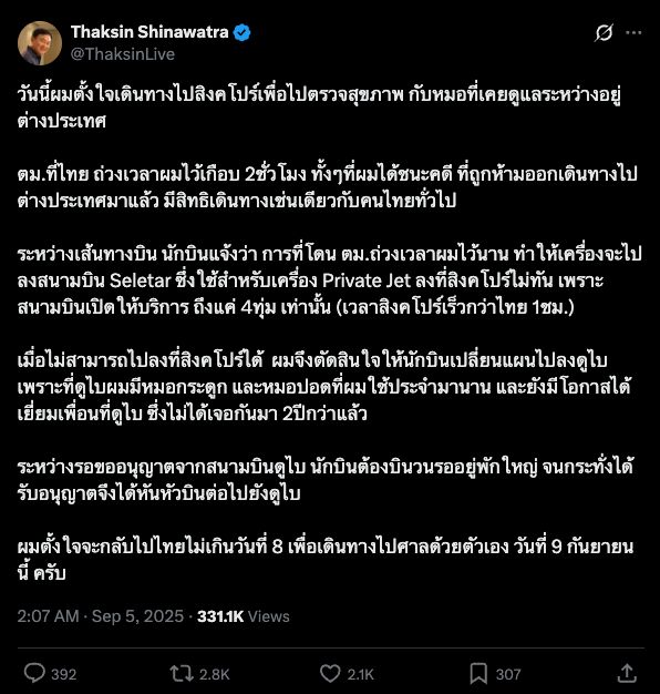 วันที่ 5 กันยายน 2568 เมื่อเวลา 02.07 น. ตามเวลาประเทศไทย นายทักษิณ ชินวัตร อดีตนายกรัฐมนตรี ได้โพสต์ข้อความผ่าน X (ทวิตเตอร์) ภายหลังใช้เครื่องบินเจ็ตส่วนตัวเดินทางไปต่างประเทศ ว่า วันนี้ตนตั้งใจเดินทางไปสิงคโปร์เพื่อไปตรวจสุขภาพ กับหมอที่เคยดูแลระหว่างอยู่ต่างประเทศ ตม.ที่ไทย ถ่วงเวลาตนไว้เกือบ 2 ชั่วโมง ทั้งๆ ที่ตนได้ชนะคดีที่ถูกห้ามออกเดินทางไปต่างประเทศมาแล้ว มีสิทธิเดินทางเช่นเดียวกับคนไทยทั่วไป