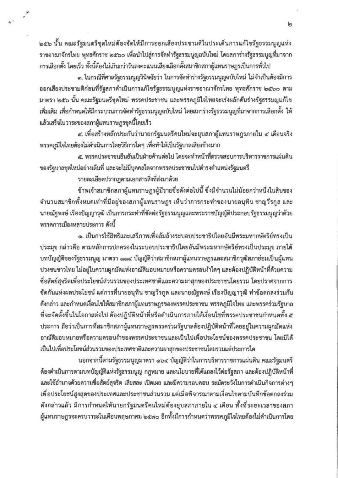 2. ในกรณีที่ศาลรัฐธรรมนูญวินิจฉัยว่า ในการจัดทำร่างรัฐธรรมนูญฉบับใหม่ จำเป็นต้องมีการออกเสียงประชามติก่อนที่รัฐสภาจะดำเนินการแก้ไขรัฐธรรมนูญแห่งราชอาณาจักรไทย พุทธศักราช 2560 ตามมาตรา 256 นั้น คณะรัฐมนตรีชุดใหม่ต้องจัดให้มีการออกเสียงประชามติในประเด็นการแก้ไขรัฐธรรมนูญแห่งราชอาณาจักรไทย พุทธศักราช 2560 เพื่อนำไปสู่การจัดทำรัฐธรรมนูญฉบับใหม่ โดยสภาร่างรัฐธรรมนูญที่มาจากการเลือกตั้งโดยเร็ว ทั้งนี้ต้องไม่เกินกว่าวันลงคะแนนเสียงเลือกตั้งสมาชิกสภาผู้แทนราษฎรเป็นการทั่วไป