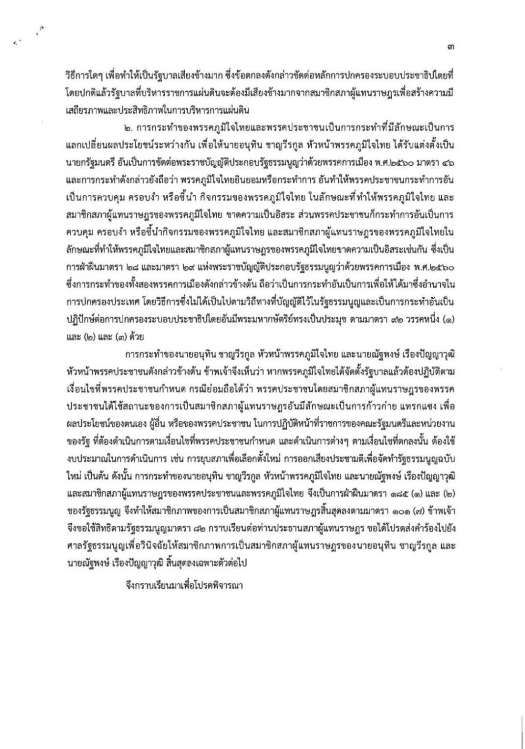 ข้าพเจ้าจึงขอใช้สิทธิตามรัฐธรรมนูญมาตรา 2 กราบเรียนต่อท่านประธานสภาผู้แทนราษฎร ขอได้โปรดส่งคำร้องไปยังศาลรัฐธรรมนูญเพื่อวินิจฉัยให้สมาชิกภาพการเป็นสมาชิกสภาผู้แทนราษฎรของ นายอนุทิน ชาญวีรกูล และ นายณัฐพงษ์ เรืองปัญญาวุฒิ สิ้นสุดลงเฉพาะตัวต่อไป จึงกราบเรียนมาเพื่อโปรดพิจารณา”