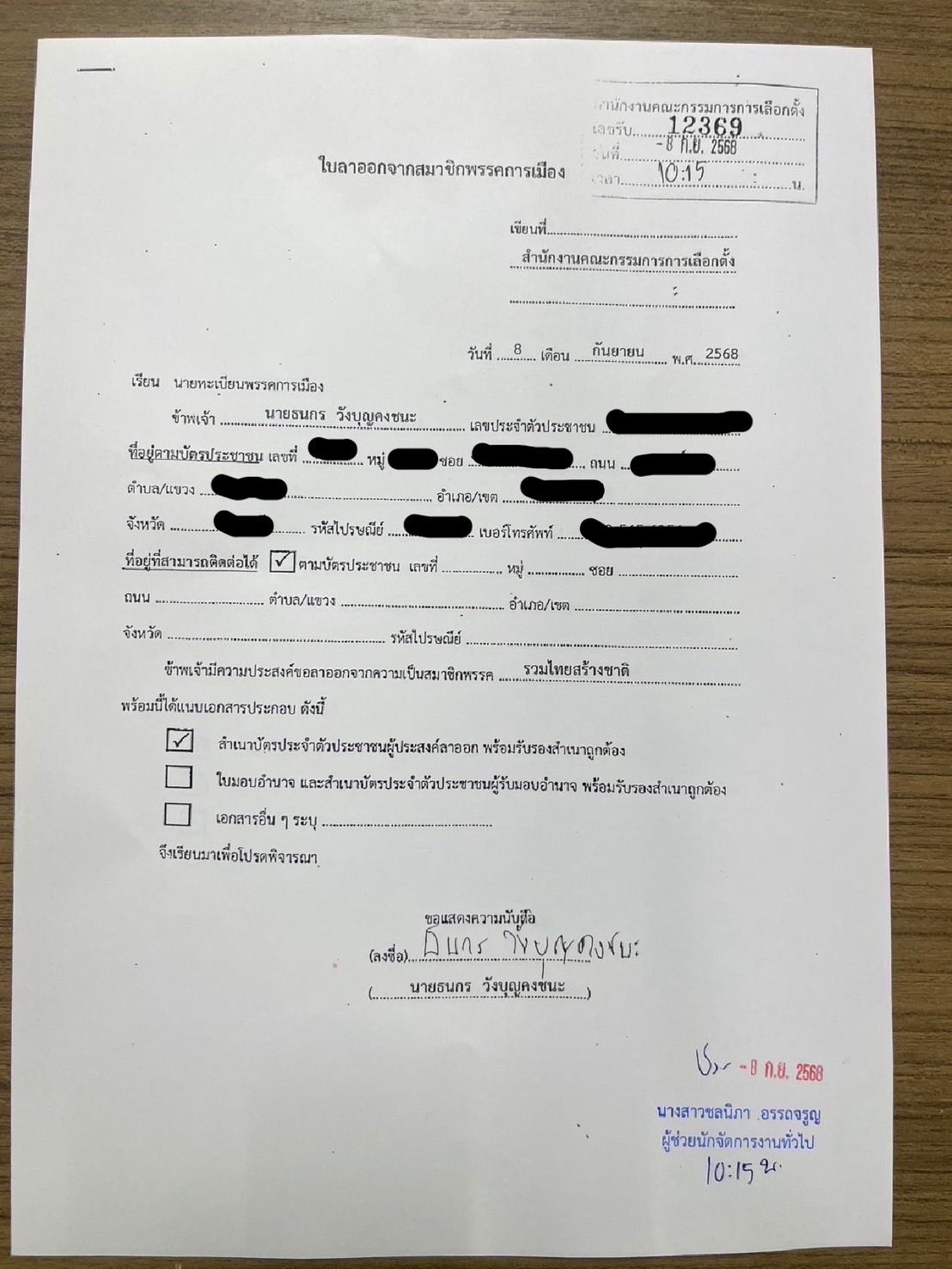 ล่าสุด พบว่าหนังสือลาออกจากสมาชิกพรรคการเมืองของ นายธนกร ยื่นต่อสำนักงาน กกต. แล้วลงเวลา 10.15 น. วันที่ 8 กันยายน 2568
