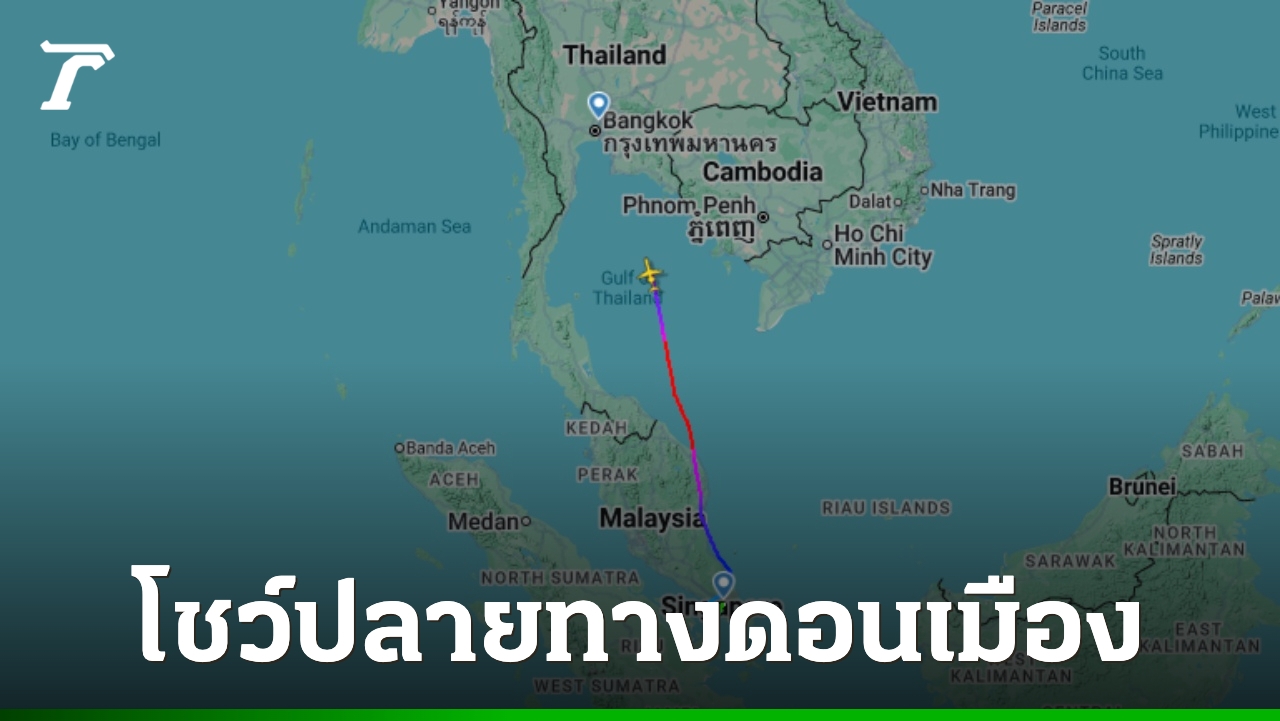 ข้อมูลจาก Flightradar 24 เครื่องบิน "ทักษิณ" โชว์เส้นทางสิงคโปร์ ปลายทางที่ดอนเมือง ล่าสุดเข้าเขตอ่าวไทยแล้ว มุ่งหน้าเข้ากรุงเทพฯ
