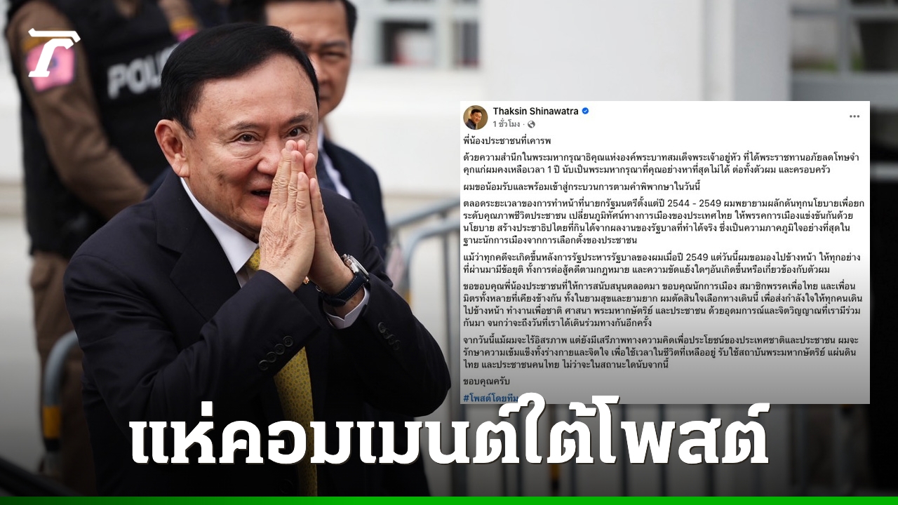 คนแสดงความคิดเห็นให้กำลังใจ ใต้โพสต์ในเฟซบุ๊ก "ทักษิณ" ที่ระบุน้อมรับคำสั่งบังคับโทษ สำนึกในพระมหากรุณาธิคุณ ได้ลดโทษเหลือ 1 ปี