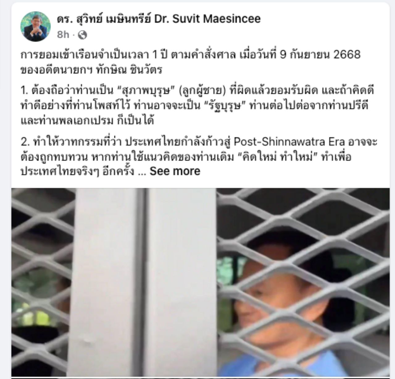 วันที่ 10 ก.ย. 2568 ดร.สุวิทย์ เมษินทรีย์ อดีตรัฐมนตรีว่าการกระทรวงอุดมศึกษา วิทยาศาสตร์ วิจัยและนวัตกรรม ในสมัยรัฐบาลพล.อ.ประยุทธ์ จันทร์โอชา โพสต์เฟซบุ๊ก ถึงกรณีที่นายทักษิณ ชินวัตร อดีตนายกรัฐมนตรี ยอมเข้าเรือนจำตามคำสั่งของศาลฎีกาว่า ต้องถือว่านายทักษิณเป็น “สุภาพบุรุษ” (ลูกผู้ชาย) ที่ผิดแล้วยอมรับผิด “ถ้าคิดดีทำดีอย่างที่ท่านโพสต์ไว้ ท่านอาจจะเป็น “รัฐบุรุษ” ท่านต่อไปต่อจากท่านปรีดีและท่านพลเอกเปรม ก็เป็นได้”
