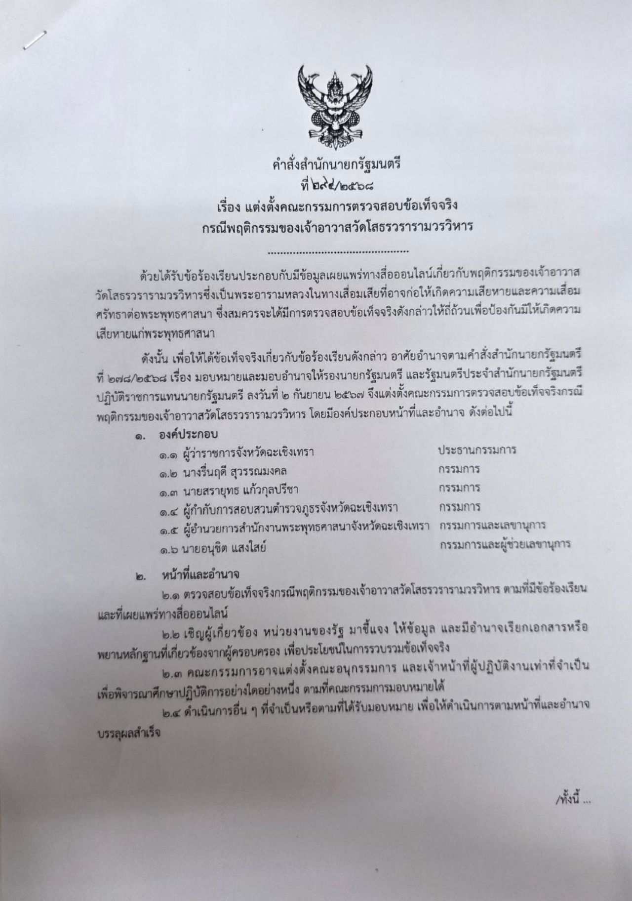 เมื่อเวลา 15.50 น. วันที่ 12 ก.ย.2568 ที่ทำเนียบรัฐบาล นายสุชาติ ตันเจริญ รัฐมนตรีประจำสำนักนายกรัฐมนตรี กล่าวถึงกรณี มีการร้องเรียนวัดโสธรวรารามวรวิหารผ่านโซเชียลมีเดีย เกี่ยวกับการประพฤติปฏิบัติไม่ถูกต้อง เข้าข่ายกระทำความผิดพระธรรมวินัย ซึ่งถือเป็นเรื่องใหญ่ โดยการร้องเรียนเป็นเรื่องทรัพย์สินและเรื่องสีกา ซึ่งเจ้าอาวาสวัดโสธรฯ เป็นเจ้าคณะจังหวัด และเป็นพระสังฆาธิการด้วย ดังนั้น จึงต้องให้ความเป็นธรรม ทั้งกับผู้ร้องและประชาชน รวมถึงตัวเจ้าอาวาสด้วย เพราะหากไม่เป็นความจริงจะทำให้เสื่อมเสียชื่อเสียง ตนจึงได้มอบหมายให้ผู้ว่าราชการจังหวัดฉะเชิงเทราเป็นประธาน ตั้งคณะกรรมการเพื่อตรวจสอบหาข้อเท็จจริงให้ปรากฏ โดยเจ้าหน้าที่ระดับสูง รวมไปถึงสำนักงานพระพุทธศาสนา และให้ผู้ตรวจของสำนักนายกรัฐมนตรี เข้าไปเป็นคณะกรรมการด้วย เพราะไม่ทราบว่าในโลกออนไลน์พูดเพื่อความสนุกสนานหรือไม่ แต่ยอมรับว่าตนก็ได้ยินเรื่องนี้มานาน มีเค้าโครง ยืนยันว่า จะให้ความเป็นธรรมกับทุกฝ่าย และให้ผู้ร้องสบายใจ แต่หากเจ้าอาวาสทำผิดก็ต้องว่าไปตามระเบียบกฎหมาย และต้องแจ้งให้สำนักงานพระพุทธศาสนาดำเนินการต่อไป