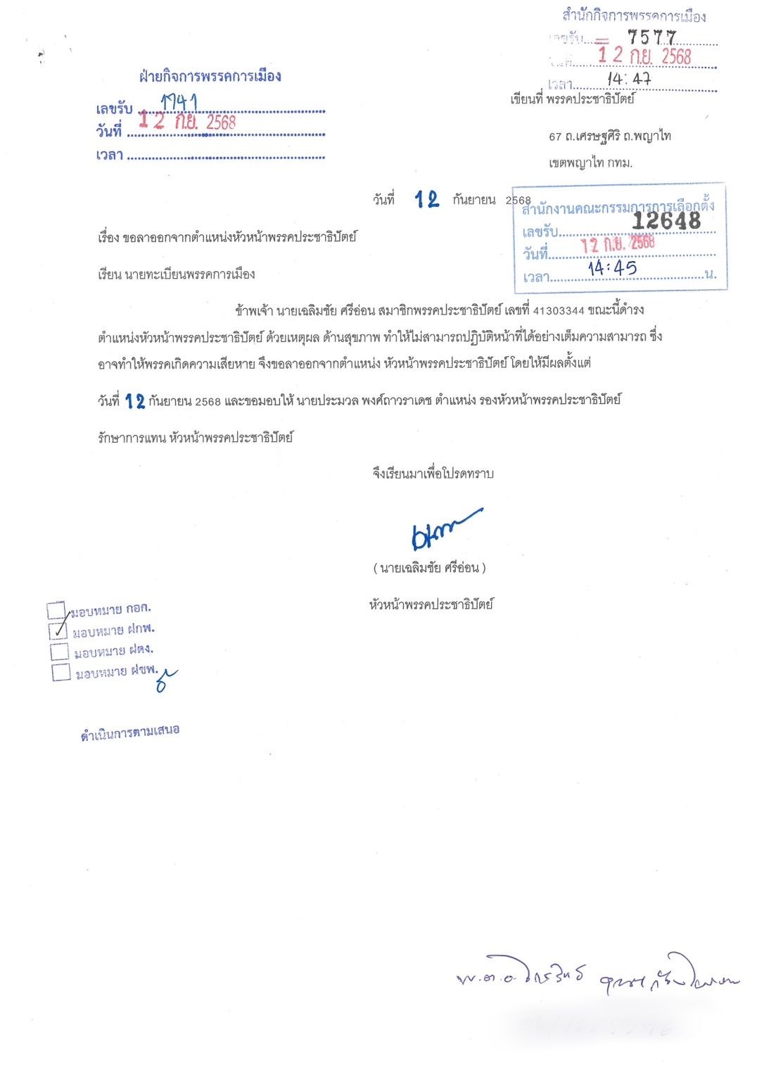 ต่อมาเวลา 17.00 น. วันที่ 12 กันยายน 2568 นายเกรียงไกร พารดอกไม้ รองเลขาธิการคณะกรรมการการเลือกตั้ง ปฏิบัติหน้าที่แทนเลขาธิการคณะกรรมการการเลือกตั้ง มีหนังสือด่วนที่สุดที่ ลพ.( ทบพ.)0014/17188 เรื่อง ขอส่งหนังสือให้หัวหน้าพรรคประชาธิปัตย์ดำเนินการตามกฎหมาย เรียน หัวหน้าพรรคประชาธิปัตย์ อ้างถึง หนังสือของนายเฉลิมชัย ศรีอ่อน ลงวันที่ 12 กันยายน 2568 จำนวน 1 ฉบับ ด้วยนายเฉลิมชัย ศรีอ่อน ได้มีหนังสือลงวันที่ 12 กันยายน 2568 แจ้งต่อนายทะเบียนพรรคการเมือง กรณีขอลาออกจากหัวหน้าพรรคประชาธิปัตย์ รายละเอียดปรากฏตามสิ่งที่ส่งมาด้วย สำนักงานคณะกรรมการการเลือกตั้ง ขอเรียนว่า กรณีดังกล่าวข้างต้นเป็นการเปลี่ยนแปลงมาตรา 38 วรรคสาม แห่งพระราชบัญญัติประกอบรัฐธรรมนูญว่าด้วยพรรคการเมือง พ.ศ. 2560