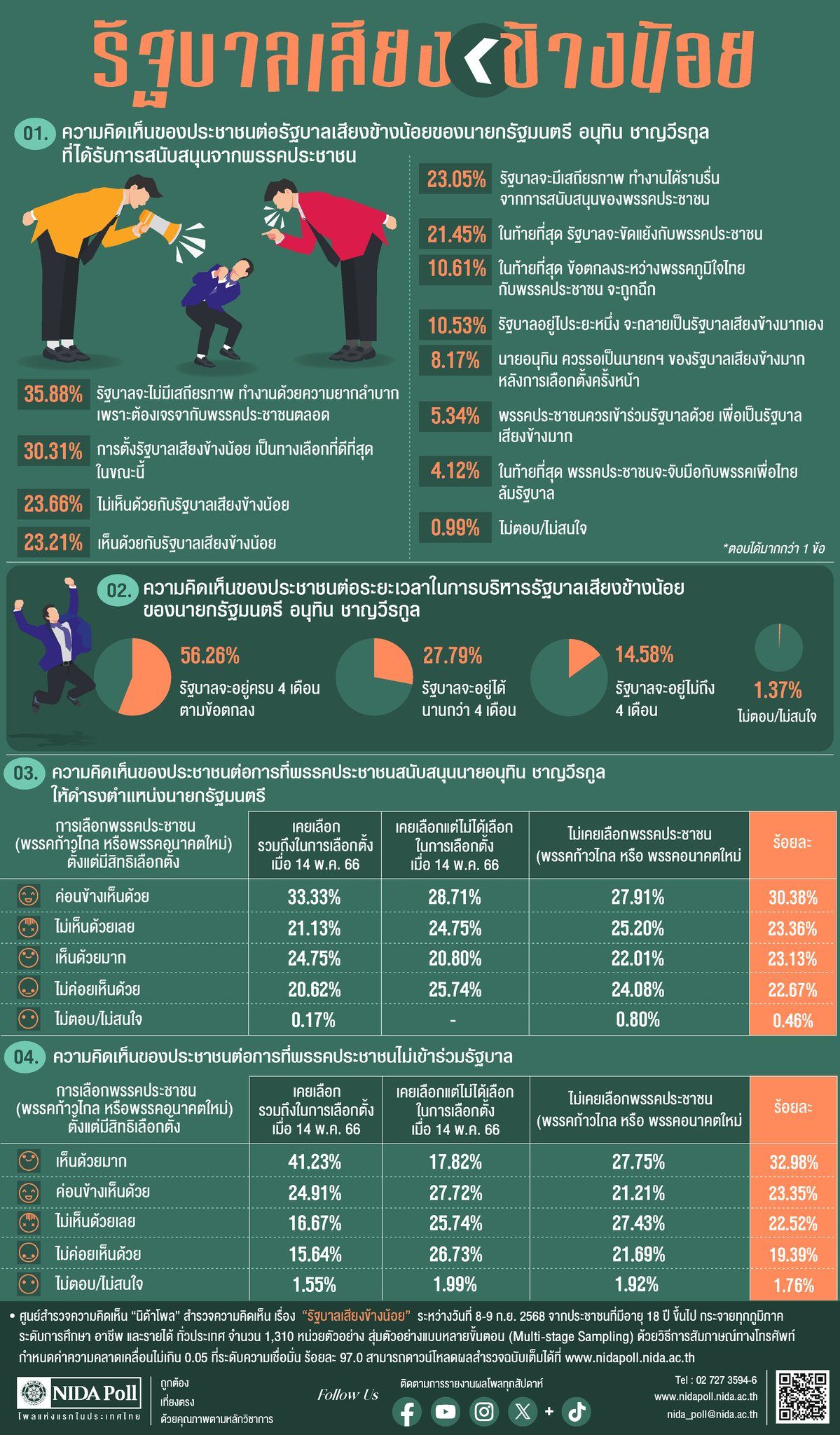 วันที่ 14 กันยายน 2568 ศูนย์สำรวจความคิดเห็น นิด้าโพล สถาบันบัณฑิตพัฒนบริหารศาสตร์ (นิด้า) เปิดเผยผลการสำรวจ เรื่อง “รัฐบาลเสียงข้างน้อย” ทำการสำรวจระหว่างวันที่ 8-9 กันยายน 2568 จากประชาชนที่มีอายุ 18 ปีขึ้นไป กระจายทุกภูมิภาค ระดับการศึกษา อาชีพ และรายได้ ทั่วประเทศ รวมจำนวนทั้งสิ้น 1,310 หน่วยตัวอย่าง เกี่ยวกับความคิดเห็นของประชาชนต่อรัฐบาลเสียงข้างน้อยภายใต้การนำของ นายอนุทิน ชาญวีรกูล นายกรัฐมนตรี
