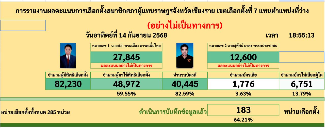 วันที่ 14 ก.ย. 2568 ผู้สื่อข่าวรายงานว่า ผลการนับคะแนนเลือกตั้งซ่อม สส.เชียงราย เขต 7 แบบไม่เป็นทางการ ล่าสุดเมื่อเวลา 18.55 น. ทางคณะกรรมการการเลือกตั้งประจำจังหวัดเชียงราย ได้นับคะแนนไปแล้ว เกินกว่า 84% นับไปแล้ว 183 หน่วย จากหน่วยเลือกตั้งทั้งหมด 285 หน่วย พบว่า