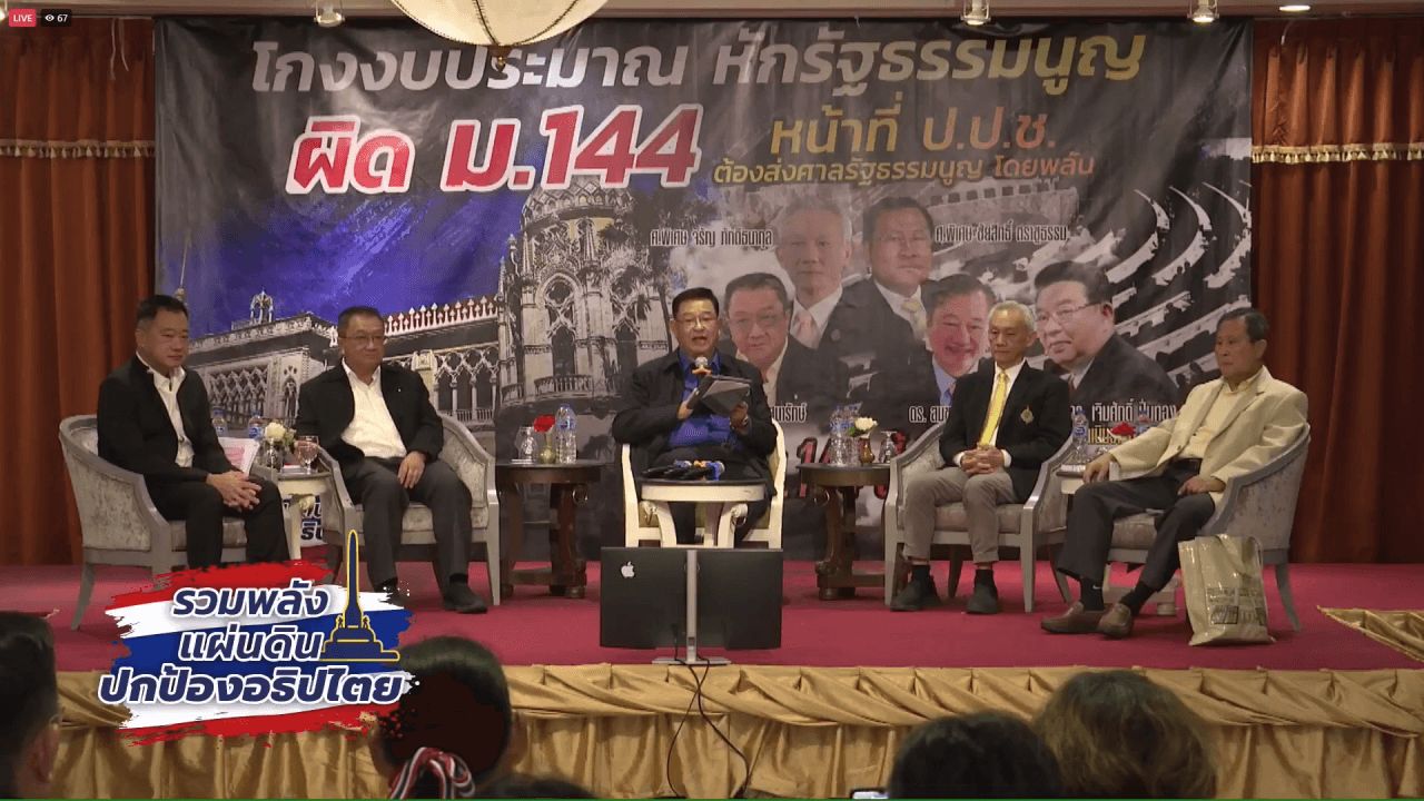 เมื่อเวลา 09.00 น. วันที่ 15 กันยายน 2568 ที่โรงแรมรัตนโกสินทร์ ถนนราชดำเนิน คณะรวมพลังแผ่นดินปกป้องอธิปไตย จัดเสวนาในหัวข้อ “รัฐธรรมนูญมาตรา 144 ชี้ชะตาประเทศ” โดยมี นายจรัญ ภักดีธนากุล อดีตตุลาการศาลรัฐธรรมนูญ, นายชัยสิทธิ์ ตราชูธรรม อดีตประธานคณะกรรมการตรวจเงินแผ่นดิน (คตง.) และอดีตผู้พิพากษาอาวุโสในศาลอุทธรณ์, นายชาญชัย อิสระเสนารักษ์ อดีต สส.นครนายก พรรคประชาธิปัตย์ (ปชป.) และนายสมชาย แสวงการ อดีตสมาชิกวุฒิสภา ร่วมเสวนา โดยมี นายเจิมศักดิ์ ปิ่นทอง นักวิชาการด้านเศรษฐศาสตร์เป็นผู้ดำเนินรายการ รวมถึงมี พล.ร.อ.พะจุณณ์ ตามประทีป เข้าร่วมงานดังกล่าวด้วย