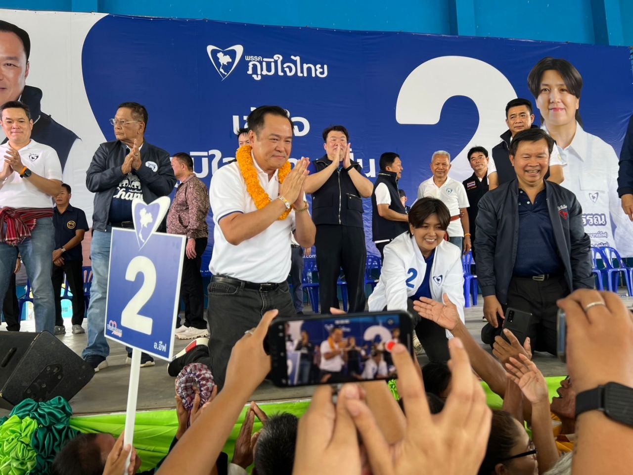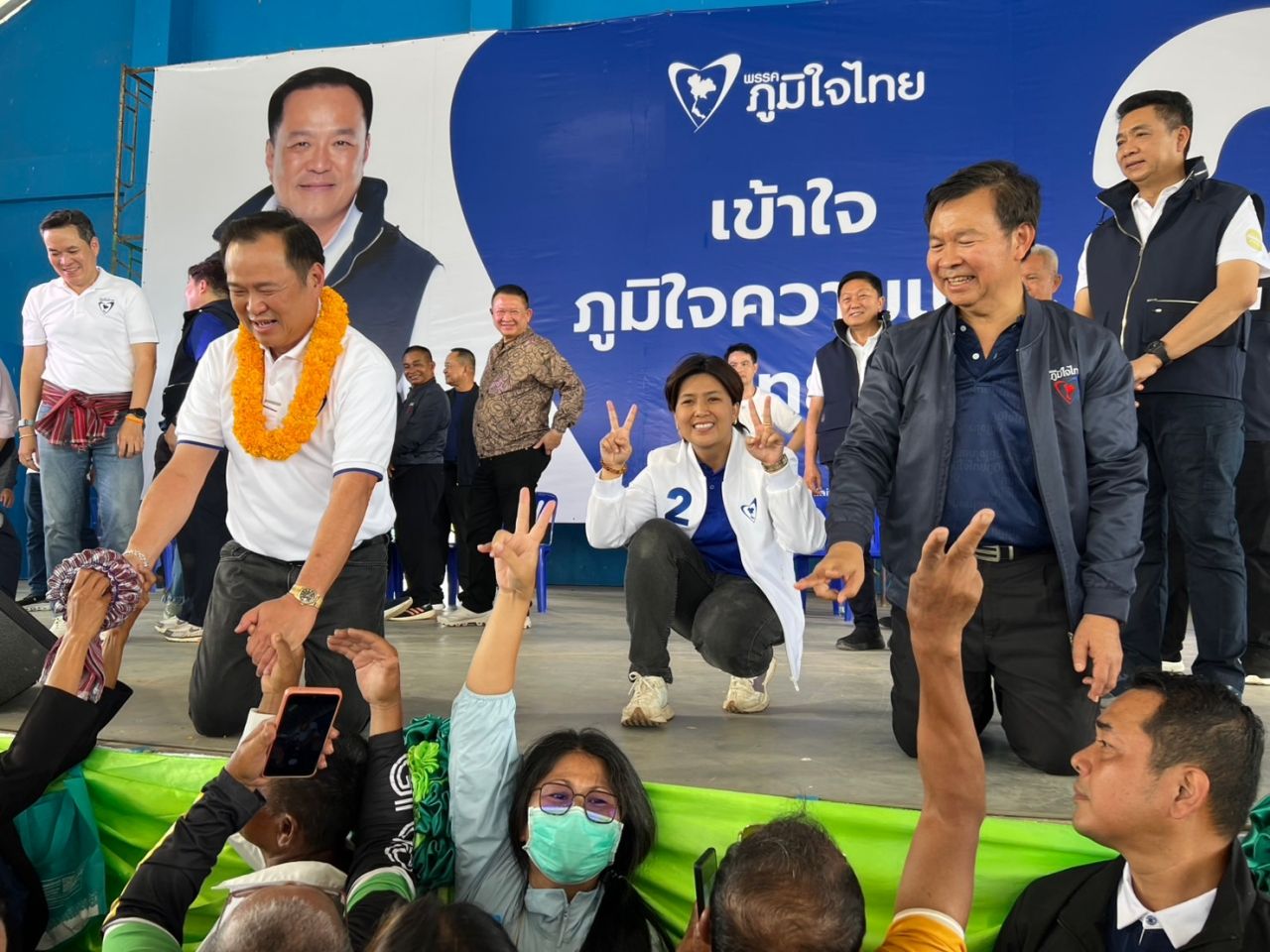 ทั้งนี้ที่เวทีปราศรัยมีชาวบ้านในพื้นที่ กลุ่มผู้สนับสนุนถือป้ายชื่อของผู้สมัครด้วย และบนเวทียังมี 18 สส.ในพื้นที่จังหวัดภาคอีสานมาร่วมปราศรัยบนเวทีด้วย รวมถึงให้การต้อนรับ นายอนุทิน ชาญวีรกูล นายกรัฐมนตรี ในฐานะหัวหน้าพรรคภูมิใจไทย โดย นายสนอง เทพอักษรณรงค์ สส.บุรีรัมย์ เขต 1 พรรคภูมิใจไทย ขึ้นกล่าวทักทายและวิพากษ์วิจารณ์การทำงานของรัฐบาลชุดเก่าในเรื่องของการช่วยเหลือเยียวยาชาวบ้านที่ได้รับผลกระทบจากเหตุความไม่สงบระหว่างชายแดนไทย-กัมพูชา