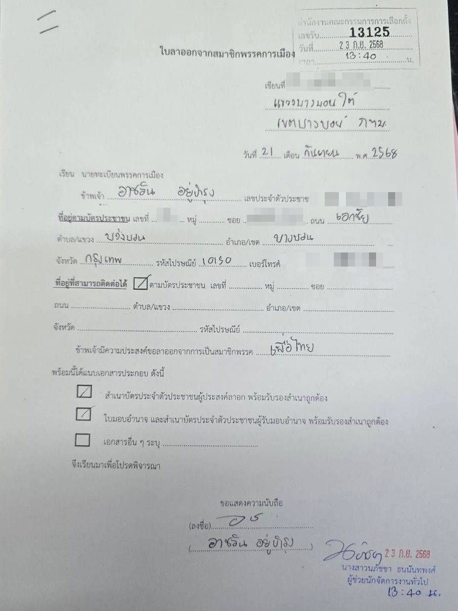 วันที่ 23 กันยายน 2568 ผู้สื่อข่าวรายงานจากพรรคเพื่อไทย ว่า ช่วงเช้าของวันที่ 23 กันยายน 2568 นายอาชวิน อยู่บำรุง หรือ กาโม่ ลูกชายของ นายวัน อยู่บำรุง อดีต สส.กทม. พรรคเพื่อไทย (ปัจจุบันเป็นกรรมการบริหารพรรคพลังประชารัฐ) และยังเป็นหลานของ ร.ต.อ.เฉลิม อยู่บำรุง สส.บัญชีรายชื่อ พรรคเพื่อไทย โดยนายอาชวิน ได้ยื่นหนังสือลาออกจากการเป็นสมาชิกพรรคเพื่อไทย