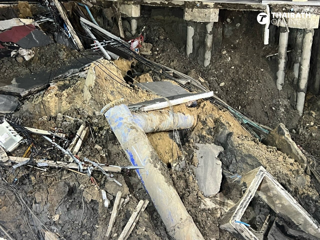 ขณะที่บรรยากาศล่าสุด ยังไม่สามารถอุดบริเวณปล่องที่ยุบลงไปบริเวณอุโมงค์รถไฟฟ้าสายสีม่วงได้ เนื่องจากติดปัญหา ตรงที่มีบล็อกคอนกรีตขนาด 4-8 เมตร ซึ่งเป็นบ่อพักสายไฟของการไฟฟ้าฯ จำนวน 4 ชิ้น ชิ้นละประมาณ 30 ตัน ที่สไลด์ลงไปขวางทาง ทำให้ไม่สามารถอัดกระสอบทรายลงไปได้ และเสี่ยงต่อการที่น้ำ และดินจะไหลเข้าไปซ้ำ จึงต้องใช้เครนขนาด 200 ตัน ที่ใช้ในการกู้อาคาร สตง.ถล่ม ที่เดินทางมาจากปทุมธานี ลงไปเกี่ยวบล็อกแล้วนำขึ้นมาก่อน ซึ่งจะได้เร่งทำให้เสร็จในค่ำคืนนี้