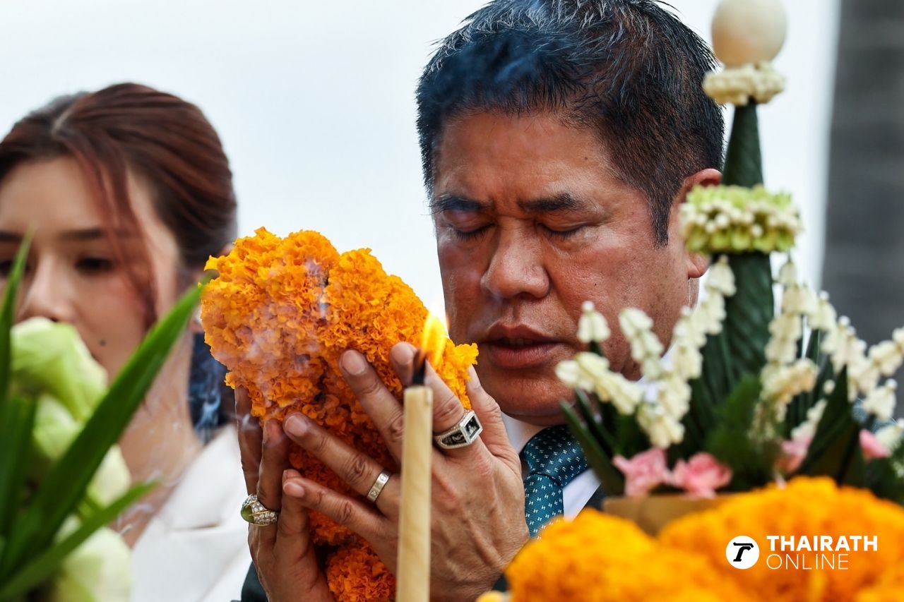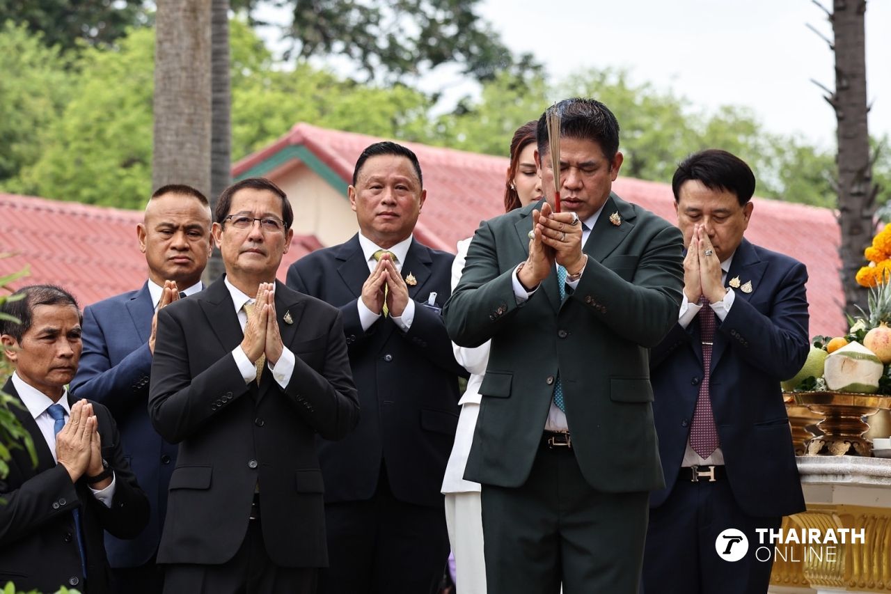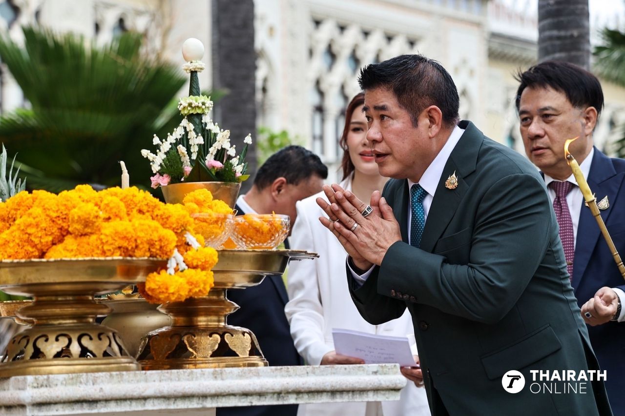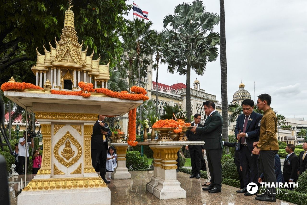วันที่ 26 กันยายน 2568 ร้อยเอกธรรมนัส พรหมเผ่า รองนายกรัฐมนตรีและรัฐมนตรีว่าการกระทรวงเกษตรและสหกรณ์ พร้อมด้วย นางสาวธนพร ศรีวิราช ภริยา และนายอรรถกร ศิริลัทธยากร รัฐมนตรีว่าการกระทรวงการท่องเที่ยวและกีฬา เข้าทำเนียบรัฐบาล โดยร้อยเอกธรรมนัสสวมชุดสูทสีเขียวเข้ม ซึ่งเป็นสีประจำกระทรวงและประจำพรรคกล้าธรรม เพื่อสักการะสิ่งศักดิ์สิทธิ์ในเวลา 09.29 น. โดยเริ่มจุดธูป 16 ดอก และหันหน้าไปยังตึกไทยคู่ฟ้า ซึ่งด้านบนมีพระพรหมอยู่ รวมถึงสวดบทสวด 16 ชั้นฟ้า 15 ชั้นดิน ซึ่งเป็นการสักการะสิ่งศักดิ์สิทธิ์ทั้งหมดที่อยู่ในทำเนียบรัฐบาล ก่อนที่จะสักการะศาลพระภูมิ-เจ้าที่ และศาลตายาย