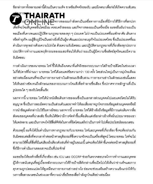 “ในช่วงเวลาไม่กี่สัปดาห์ที่ผ่านมา สื่อมวลชนต่างประเทศรายนี้ได้เผยแพร่ข้อความกว่า 130 ครั้ง โดยส่วนใหญ่เป็นการมุ่งโจมตีผม อย่างต่อเนื่องแทนที่จะเป็นการรายงานข่าวในลักษณะเชิงสืบสวน การรายงานข่าวในลักษณะเช่นนี้แสดงให้เห็นอย่างชัดเจนถึงลักษณะของกระบวนการโจมตีเพื่อทำลายชื่อเสียง ซึ่งปราศจากหลักฐานที่เป็นรูปธรรมใด ๆ รองรับโดยสิ้นเชิง” นอกจากนี้ ยังได้นำหนังสือเดินทางของตนซึ่งเป็นเอกสารส่วนบุคคลไปเผยแพร่โดยไม่ได้รับอนุญาต ซึ่งเป็นการละเมิดความเป็นส่วนตัวและอาจทำให้ตนเสี่ยงอาจถูกโจรกรรมข้อมูลส่วนบุคคลหรือมีการนำข้อมูลดังกล่าวไปใช้ในทางมิชอบ