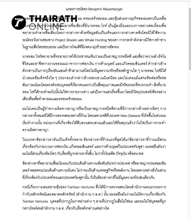 “เบนจามิน เมาเออร์เบอร์เกอร์” ร่อนแถลงการณ์ซัดตกเป็นเหยื่อขบวนการจ้องทำลายชื่อเสียง ยืนยันประกอบอาชีพสุจริต ไม่เคยมีความผิดทางอาญาตามที่ถูกกล่าวหา ประกาศฟ้องเพื่อปกป้องชื่อเสียงตัวเอง ครอบครัวและธุรกิจ