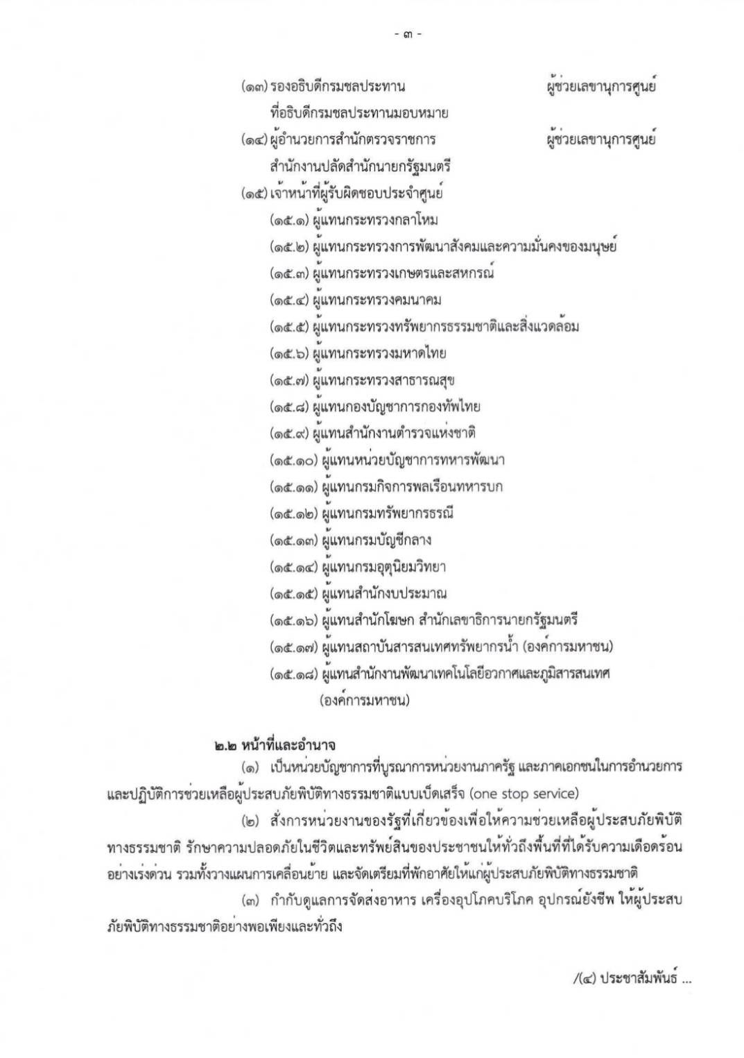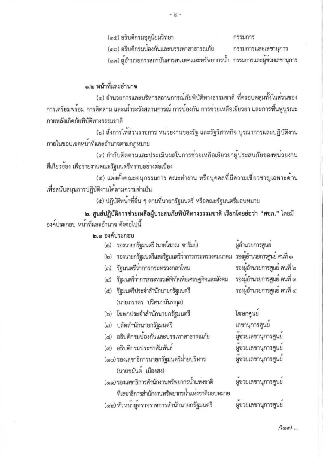 ทั้งนี้ คอภ. มีนายกรัฐมนตรีเป็นประธาน ทำหน้าที่อำนวยการและบริหารจัดการภัยพิบัติทั้งระบบ ตั้งแต่การเตรียมพร้อม ติดตามเฝ้าระวัง การป้องกัน การช่วยเหลือในระหว่างเกิดเหตุ ไปจนถึงการฟื้นฟูหลังสิ้นสุดเหตุการณ์ อีกทั้งยังมีอำนาจสั่งการหน่วยงานราชการ รัฐวิสาหกิจ และองค์กรที่เกี่ยวข้องให้บูรณาการทำงานร่วมกัน รวมถึงสามารถแต่งตั้งคณะทำงานหรือผู้เชี่ยวชาญเฉพาะด้านมาสนับสนุนได้ตามความจำเป็น