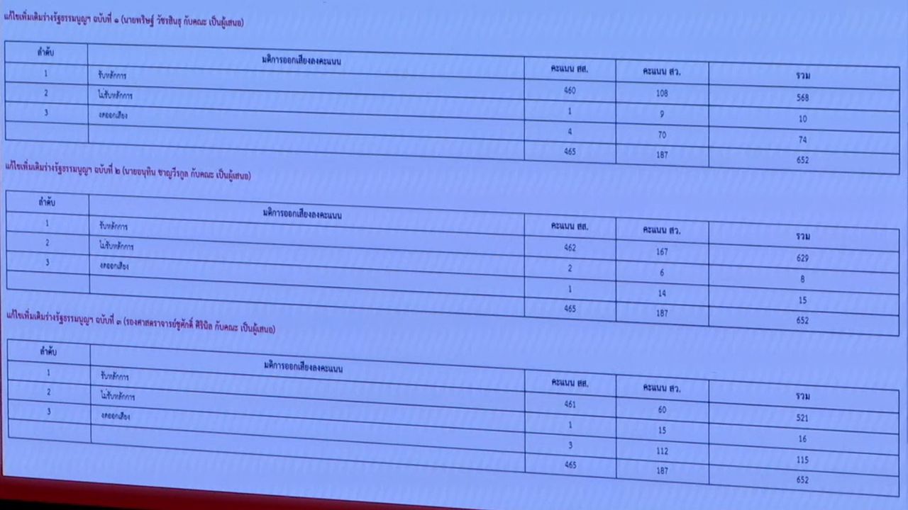 ที่ประชุมร่วมรัฐสภา พร้อมใจโหวตรับหลักการร่างแก้ไขรัฐธรรมนูญ ทั้ง 2 ฉบับ ของพรรคประชาชน และภูมิใจไทย แต่ตีตกร่างแก้ไขรัฐธรรมนูญของพรรคเพื่อไทย เหตุ สว. ลงคะแนน 60 เสียง ไม่ถึง 1 ใน 3 ถือว่าที่ประชุมร่วมรัฐสภา ไม่รับหลักการ