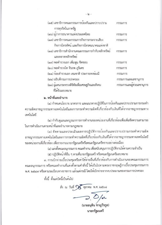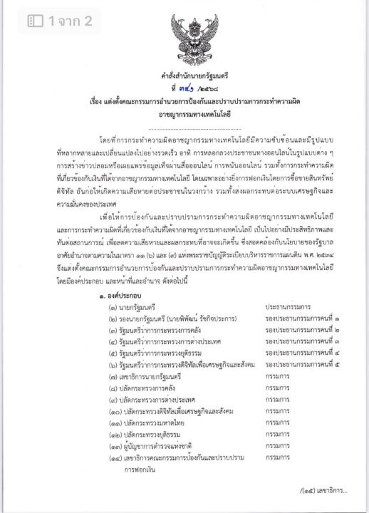 วันที่ 15 ต.ค.2568 ผู้สื่อข่าวรายงานว่า นายอนุทิน ชาญวีรกูล นายกรัฐมนตรี ลงนามคำสั่งสำนักนายกรัฐมนตรีที่ 341/2568 เรื่อง แต่งตั้งคณะกรรมการอำนวยการป้องกันและปราบปรามการกระทำความผิดอาชญากรรมทางเทคโนโลยี โดยที่การกระทำความผิดอาชญากรรมทางเทคโนโลยีมีความซับซ้อนและมีรูปแบบที่หลากหลายและเปลี่ยนแปลงไปอย่างรวดเร็ว อาทิ การหลอกลวงประชาชนทางออนไลน์ในรูปแบบต่าง ๆ การสร้างข่าวปลอมหรือเผยแพร่ข้อมูลเท็จผ่านสื่อออนไลน์ การพนันออนไลน์ รวมทั้ง การกระทำความผิดที่เกี่ยวข้องกับเงินที่ได้จากอาชญากรรมทางเทคโนโลยี โดยเฉพาะอย่างยิ่งการฟอกเงินโดยการซื้อขายสินทรัพย์ดิจิทัล อันก่อให้เกิดความเสียหายต่อประชาชนในวงกว้าง รวมทั้งส่งผลกระทบต่อระบบเศรษฐกิจและความมั่นคงของประเทศ