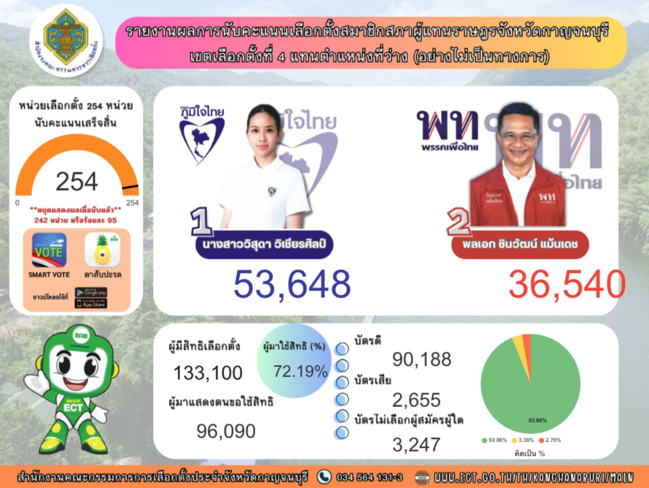กกต.กาญจนบุรี ประกาศผลคะแนนเลือกตั้งซ่อม สส.กาญจนบุรี เขต 4 นับแล้ว 100% “วิสุดา” ภูมิใจไทย ชนะ “พล.อ.ชินวัฒน์” จากเพื่อไทย ห่างกัน 17,108 คะแนน ส่วนบัตรไม่เลือกผู้สมัครผู้ใด มีกว่า 3,200 ใบ