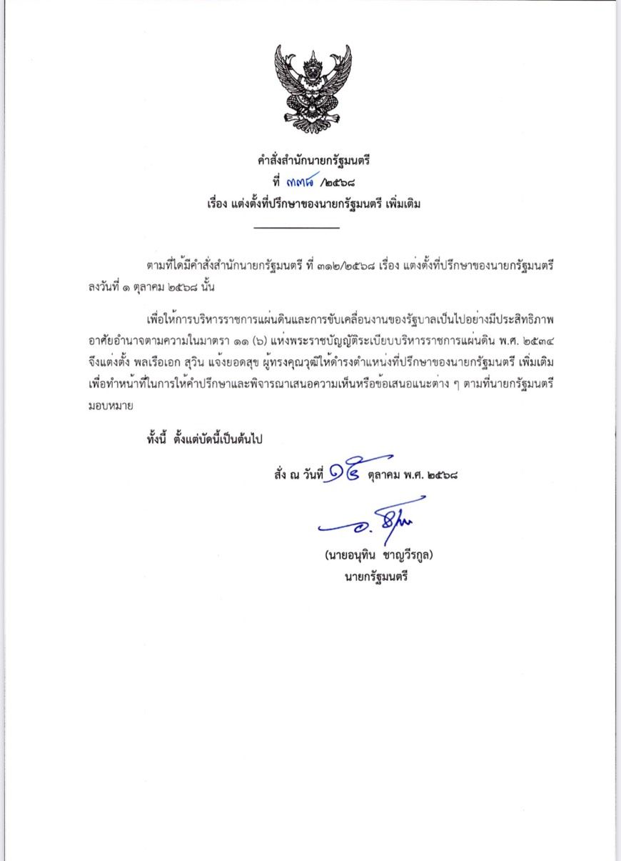 วันที่ 21 ตุลาคม 2568 ผู้สื่อข่าวรายงานว่า นายอนุทิน ชาญวีรกูล นายกรัฐมนตรีและรัฐมนตรีว่าการกระทรวงมหาดไทย ลงนามคำสั่งสำนักนายกรัฐมนตรี ที่ 338/2568 เรื่อง แต่งตั้งที่ปรึกษาของนายกรัฐมนตรีเพิ่มเติม ทั้งนี้ ตามที่ได้มีคำสั่งสำนักนายกรัฐมนตรีที่ 312/2568 ลงวันที่ 1 ตุลาคม 2568 นั้น เพื่อให้การบริหารราชการแผ่นดินและการขับเคลื่อนงานของรัฐบาลเป็นไปอย่างมีประสิทธิภาพ อาศัยอำนาจตามความในมาตรา 11 (6) แห่งพระราชบัญญัติระเบียบบริหารราชการแผ่นดิน พ.ศ. 2534 จึงแต่งตั้ง พล.ร.อ.สุวิน แจ้งยอดสุข ผู้ทรงคุณวุฒิ ให้ดำรงตำแหน่งที่ปรึกษาของนายกรัฐมนตรี เพิ่มเติม เพื่อทำหน้าที่ในการให้คำปรึกษาและพิจารณาเสนอความเห็นหรือข้อเสนอแนะต่างๆ ตามที่นายกรัฐมนตรีมอบหมาย ทั้งนี้ ตั้งแต่บัดนี้เป็นต้นไป สั่ง ณ วันที่ 15 ตุลาคม 2568