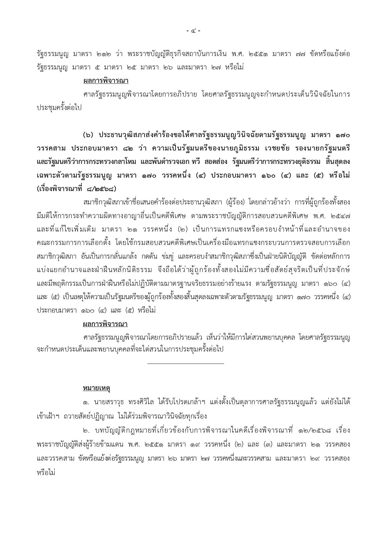 คณะตุลาการศาลรัฐธรรมนูญได้พิจารณาแล้วเห็นว่า ให้มีการไต่สวนพยานบุคคล โดยศาลรัฐธรรมนูญจะกำหนดประเด็นและพยานบุคคลที่จะไต่สวนในการประชุมครั้งต่อไป.