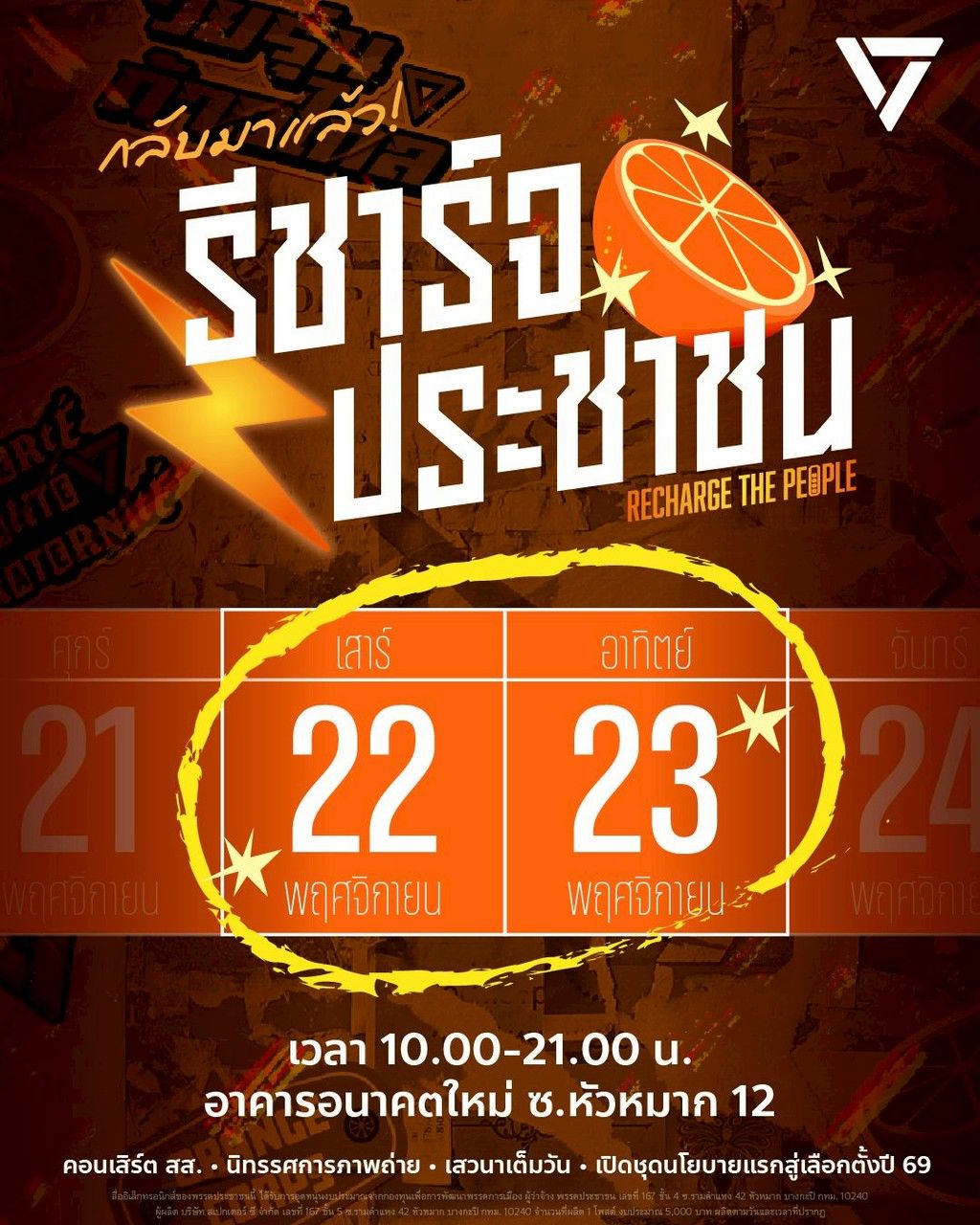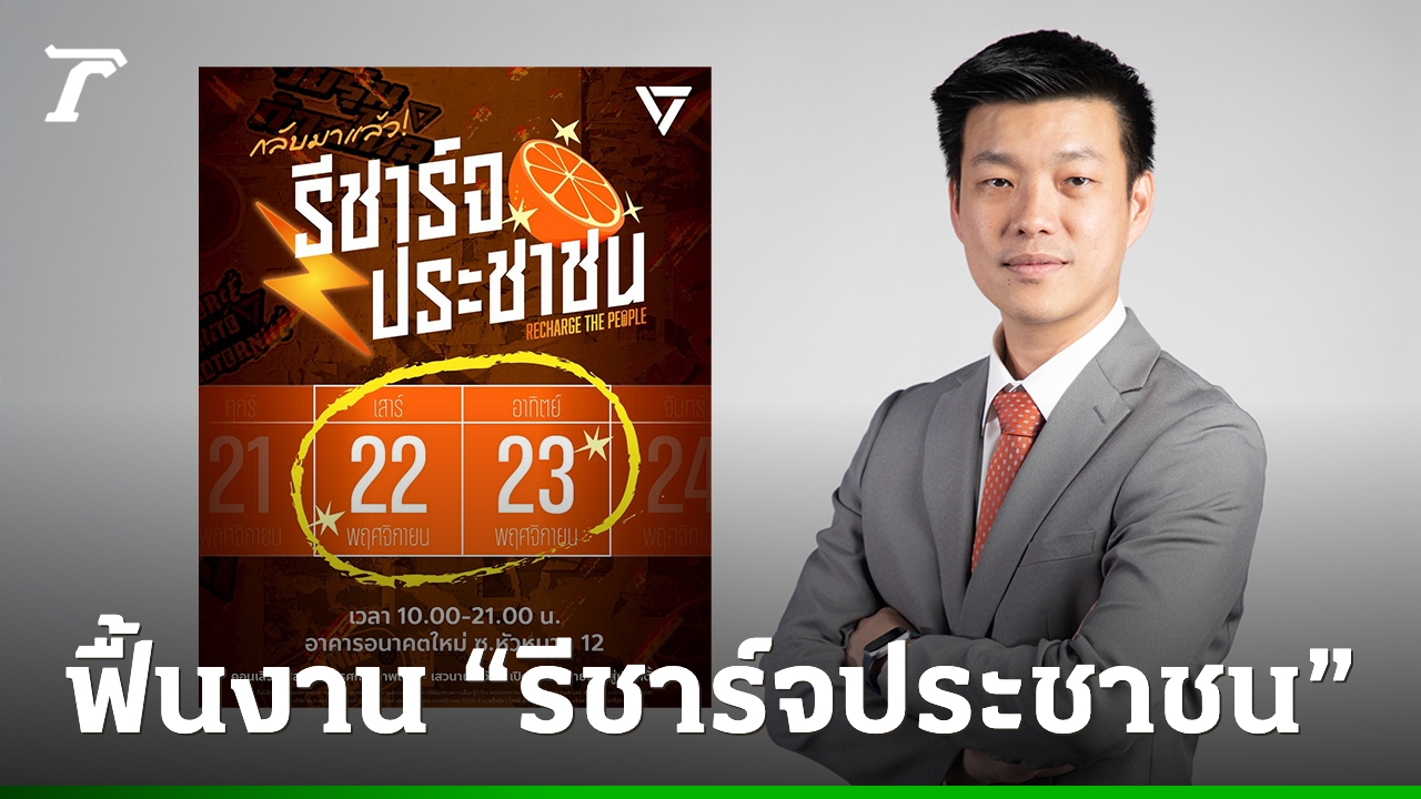พรรคประชาชน แจ้ง “งานรีชาร์จประชาชน” กลับมาแล้ว เตรียมเปิดตัวนโยบายชุดแรกสู้ศึกเลือกตั้ง 2569 วันที่ 22-23 พ.ย. นี้ พร้อมมินิคอนเสิร์ตสุดอบอุ่นจาก สส.ปชน.