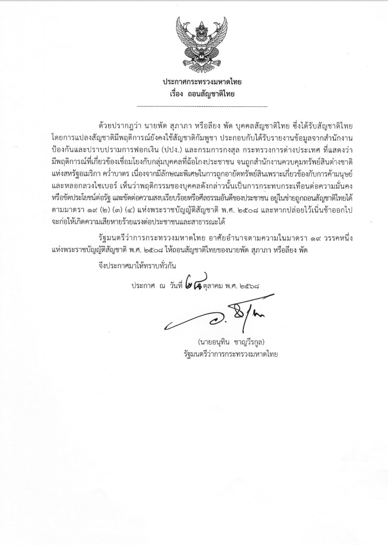 วันที่ 24 ต.ค. 2568 นายอนุทิน ชาญวีรกูล นายกรัฐมนตรีและรัฐมนตรีว่าการกระทรวงมหาดไทย ลงนามในประกาศกระทรวงมหาดไทย เรื่องถอนสัญชาติไทย โดยเนื้อหาระบุว่า ด้วยปรากฏว่า นายพัด สุภาภา หรือ ลียง พัด บุคคลสัญชาติไทย ซึ่งได้รับสัญชาติไทย โดยการแปลงสัญชาติมีพฤติการณ์ยังคงใช้สัญชาติกัมพูชา ประกอบกับได้รับรายงานข้อมูลจากสำนักงาน ป้องกันและปราบปรามการฟอกเงิน (ปปง.) และกรมการกงสุล กระทรวงการต่างประเทศ ที่แสดงว่า มีพฤติการณ์ที่เกี่ยวข้องเชื่อมโยงกับกลุ่มบุคคลที่ฉ้อโกงประชาชน จนถูกสำนักงานควบคุมทรัพย์สินต่างชาติแห่งสหรัฐอเมริกา คว่ำบาตร เนื่องจากมีลักษณะพิเศษในการถูกอายัดทรัพย์สินเพราะเกี่ยวข้องกับการค้ามนุษย์และหลอกลวงไซเบอร์ เห็นว่าพฤติกรรมของบุคคลดังกล่าวนั้นเป็นการกระทบกระเทือนต่อความมั่นคงหรือขัดประโยชน์ต่อรัฐ และขัดต่อความสงบเรียบร้อยหรือศีลธรรมอันดีของประชาชน อยู่ในข่ายถูกถอนสัญชาติไทยได้ ตามมาตรา 19 (2) (3) (4) แห่งพระราชบัญญัติสัญชาติ พ.ศ. 2508 และหากปล่อยไว้เนิ่นช้าออกไปจะก่อให้เกิดความเสียหายร้ายแรงต่อประชาชนและสาธารณะได้